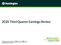 Oct 17, 2025 9:00 am EDT Huntington Bancshares 2025 Third Quarter Earnings Conference Call / Webcast Earnings ReleaseHTML Earnings WebcastAudio PresentationPDF Earnings Press Release and SupplementPDF 10-QHTML XBRL Zip