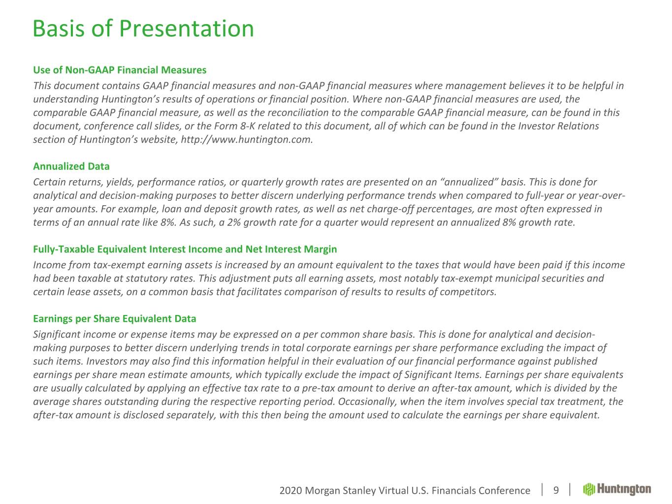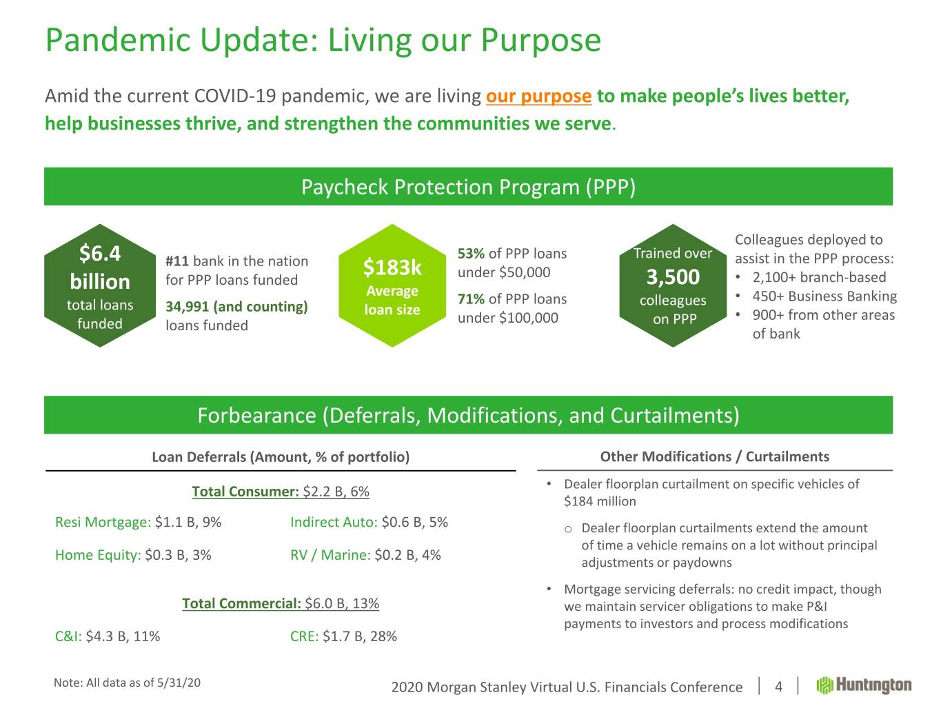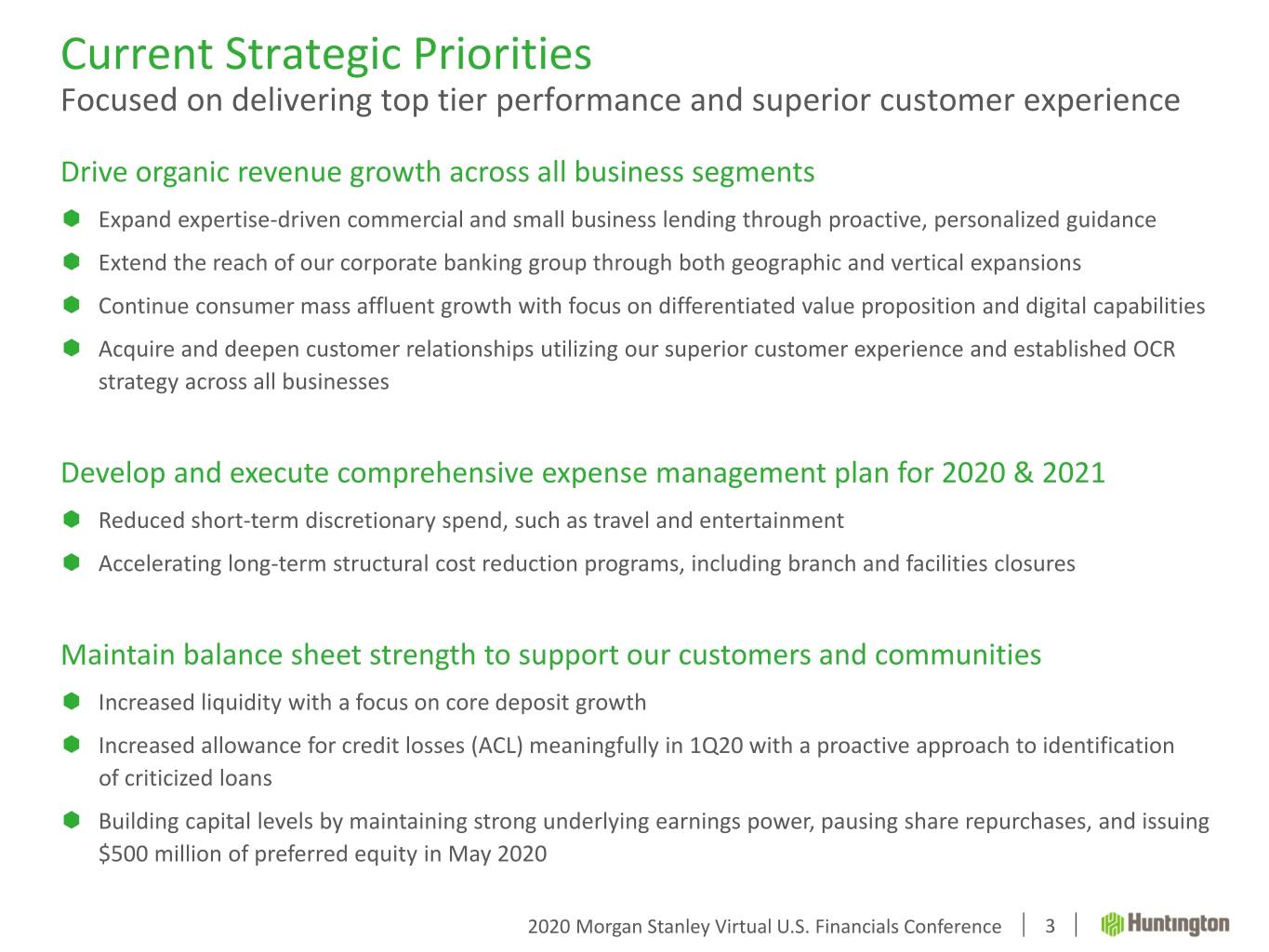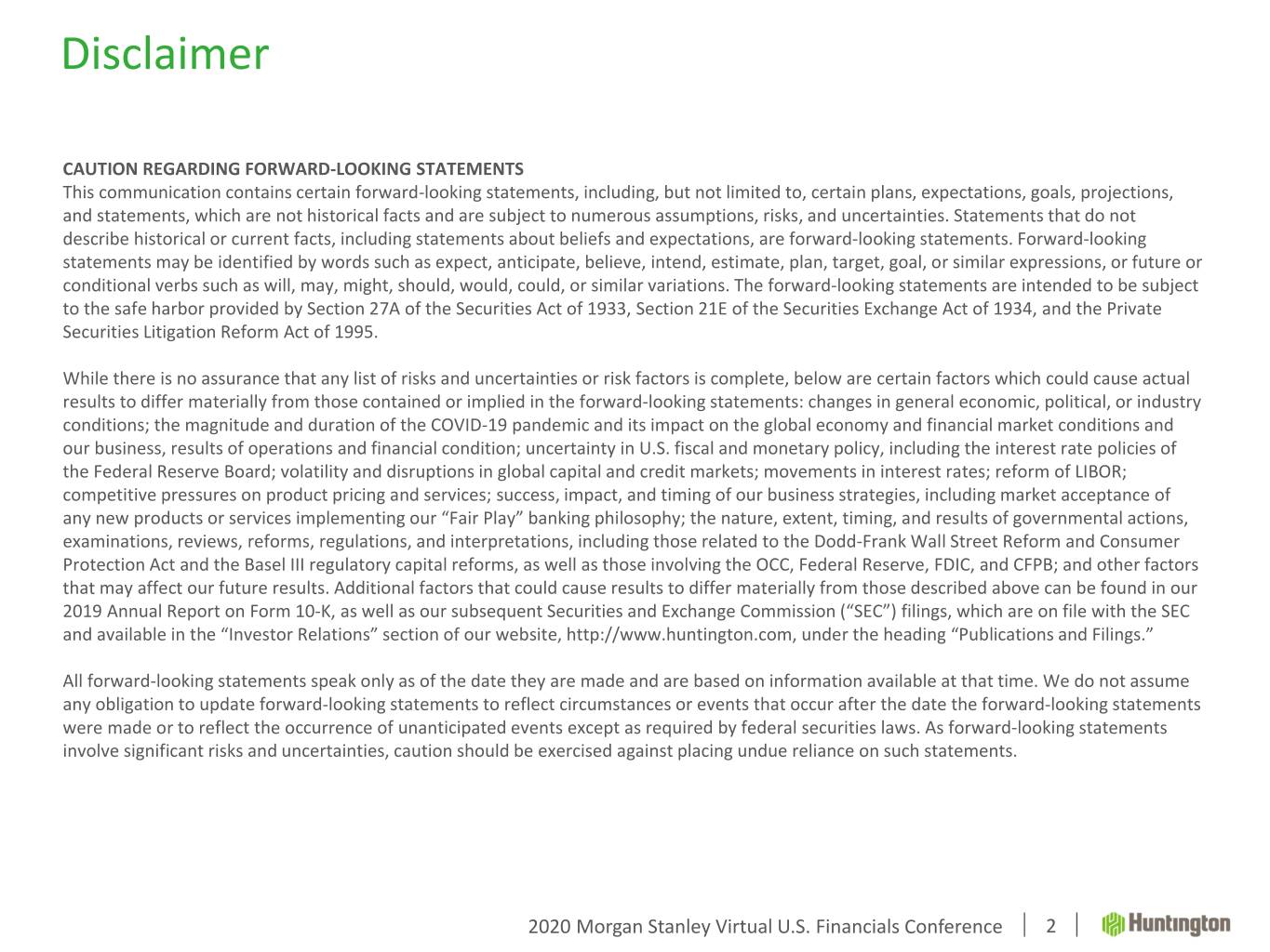 Disclaimer CAUTION REGARDING FORWARD‐LOOKING STATEMENTS This communication contains certain forward‐looking statements, including, but not limited to, certain plans, expectations, goals, projections, and statements, which are not historical facts and are subject to numerous assumptions, risks, and uncertainties. Statements that do not describe historical or current facts, including statements about beliefs and expectations, are forward‐looking statements. Forward‐looking statements may be identified by words such as expect, anticipate, believe, intend, estimate, plan, target, goal, or similar expressions, or future or conditional verbs such as will, may, might, should, would, could, or similar variations. The forward‐looking statements are intended to be subject to the safe harbor provided by Section 27A of the Securities Act of 1933, Section 21E of the Securities Exchange Act of 1934, and the Private Securities Litigation Reform Act of 1995. While there is no assurance that any list of risks and uncertainties or risk factors is complete, below are certain factors which could cause actual results to differ materially from those contained or implied in the forward‐looking statements: changes in general economic, political, or industry conditions; the magnitude and duration of the COVID‐19 pandemic and its impact on the global economy and financial market conditions and our business, results of operations and financial condition; uncertainty in U.S. fiscal and monetary policy, including the interest rate policies of the Federal Reserve Board; volatility and disruptions in global capital and credit markets; movements in interest rates; reform of LIBOR; competitive pressures on product pricing and services; success, impact, and timing of our business strategies, including market acceptance of any new products or services implementing our “Fair Play” banking philosophy; the nature, extent, timing, and results of governmental actions, examinations, reviews, reforms, regulations, and interpretations, including those related to the Dodd‐Frank Wall Street Reform and Consumer Protection Act and the Basel III regulatory capital reforms, as well as those involving the OCC, Federal Reserve, FDIC, and CFPB; and other factors that may affect our future results. Additional factors that could cause results to differ materially from those described above can be found in our 2019 Annual Report on Form 10‐K, as well as our subsequent Securities and Exchange Commission (“SEC”) filings, which are on file with the SEC and available in the “Investor Relations” section of our website, http://www.huntington.com, under the heading “Publications and Filings.” All forward‐looking statements speak only as of the date they are made and are based on information available at that time. We do not assume any obligation to update forward‐looking statements to reflect circumstances or events that occur after the date the forward‐looking statements were made or to reflect the occurrence of unanticipated events except as required by federal securities laws. As forward‐looking statements involve significant risks and uncertainties, caution should be exercised against placing undue reliance on such statements. 2020 Morgan Stanley Virtual U.S. Financials Conference 2