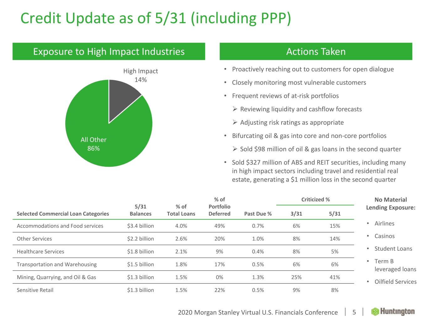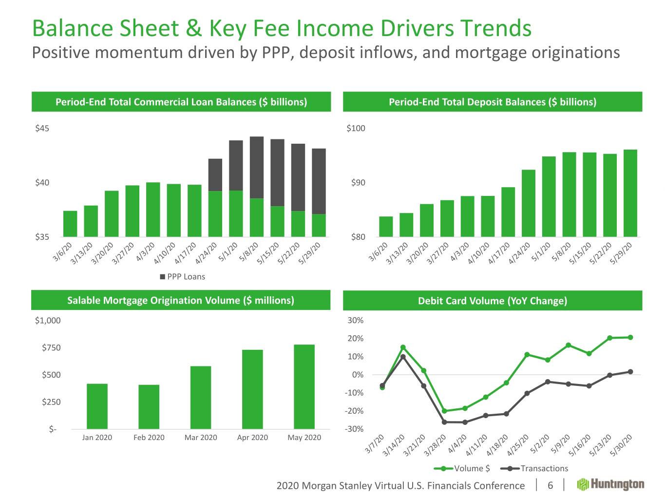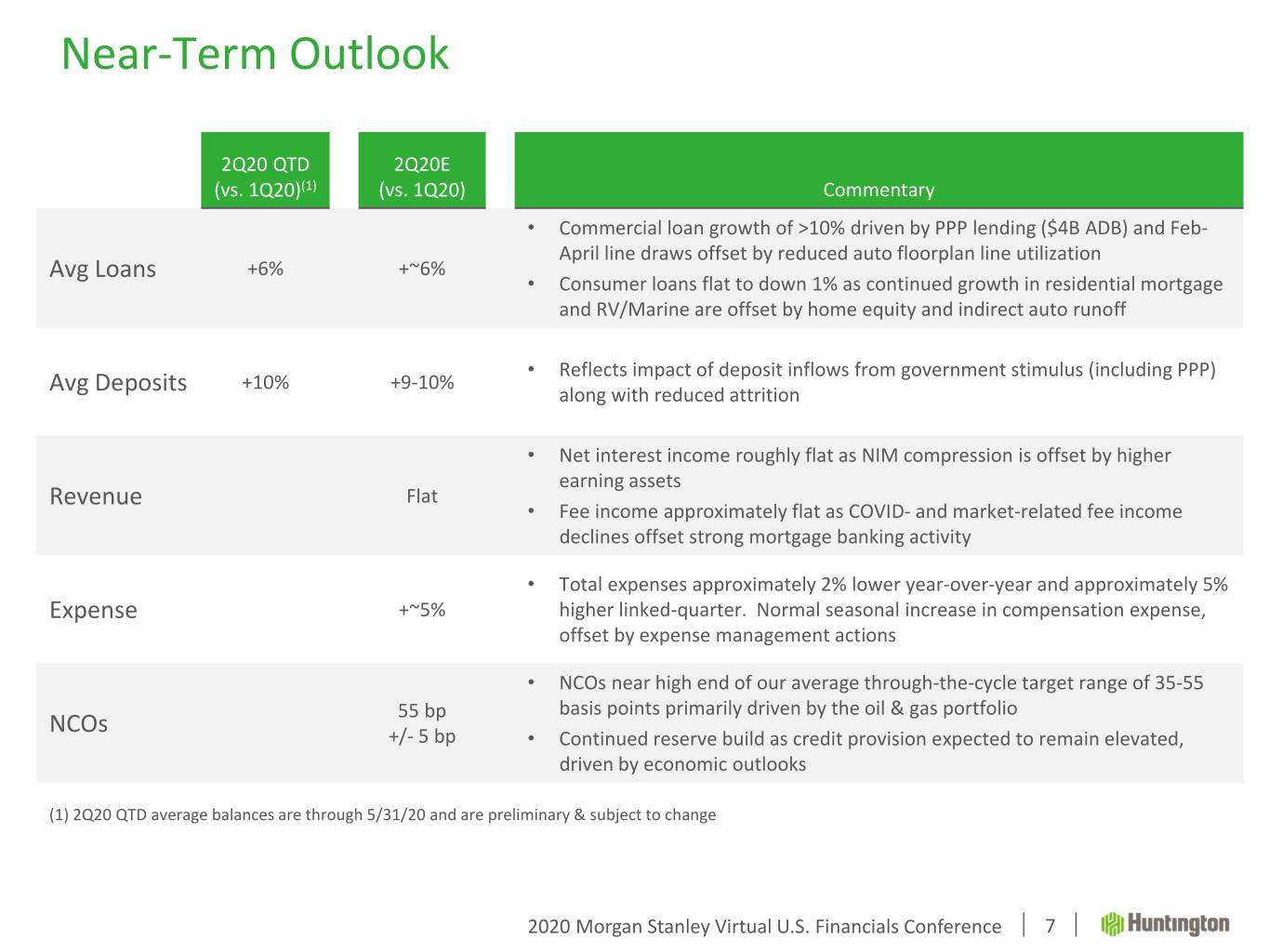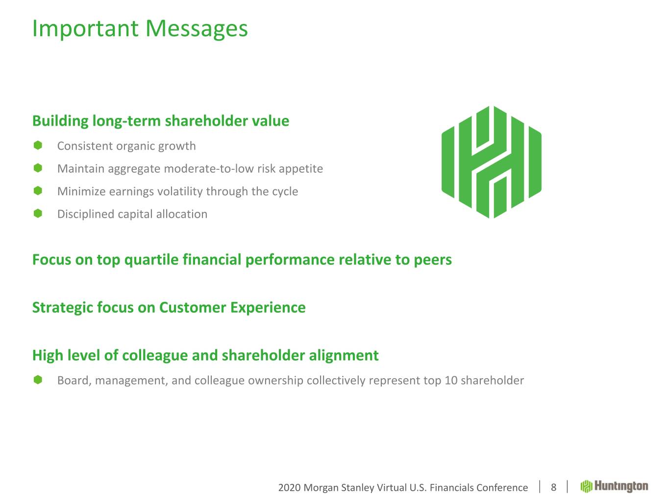 Disclaimer CAUTION REGARDING FORWARD‐LOOKING STATEMENTS This communication contains certain forward‐looking statements, including, but not limited to, certain plans, expectations, goals, projections, and statements, which are not historical facts and are subject to numerous assumptions, risks, and uncertainties. Statements that do not describe historical or current facts, including statements about beliefs and expectations, are forward‐looking statements. Forward‐looking statements may be identified by words such as expect, anticipate, believe, intend, estimate, plan, target, goal, or similar expressions, or future or conditional verbs such as will, may, might, should, would, could, or similar variations. The forward‐looking statements are intended to be subject to the safe harbor provided by Section 27A of the Securities Act of 1933, Section 21E of the Securities Exchange Act of 1934, and the Private Securities Litigation Reform Act of 1995. While there is no assurance that any list of risks and uncertainties or risk factors is complete, below are certain factors which could cause actual results to differ materially from those contained or implied in the forward‐looking statements: changes in general economic, political, or industry conditions; the magnitude and duration of the COVID‐19 pandemic and its impact on the global economy and financial market conditions and our business, results of operations and financial condition; uncertainty in U.S. fiscal and monetary policy, including the interest rate policies of the Federal Reserve Board; volatility and disruptions in global capital and credit markets; movements in interest rates; reform of LIBOR; competitive pressures on product pricing and services; success, impact, and timing of our business strategies, including market acceptance of any new products or services implementing our “Fair Play” banking philosophy; the nature, extent, timing, and results of governmental actions, examinations, reviews, reforms, regulations, and interpretations, including those related to the Dodd‐Frank Wall Street Reform and Consumer Protection Act and the Basel III regulatory capital reforms, as well as those involving the OCC, Federal Reserve, FDIC, and CFPB; and other factors that may affect our future results. Additional factors that could cause results to differ materially from those described above can be found in our 2019 Annual Report on Form 10‐K, as well as our subsequent Securities and Exchange Commission (“SEC”) filings, which are on file with the SEC and available in the “Investor Relations” section of our website, http://www.huntington.com, under the heading “Publications and Filings.” All forward‐looking statements speak only as of the date they are made and are based on information available at that time. We do not assume any obligation to update forward‐looking statements to reflect circumstances or events that occur after the date the forward‐looking statements were made or to reflect the occurrence of unanticipated events except as required by federal securities laws. As forward‐looking statements involve significant risks and uncertainties, caution should be exercised against placing undue reliance on such statements. 2020 Morgan Stanley Virtual U.S. Financials Conference 2
