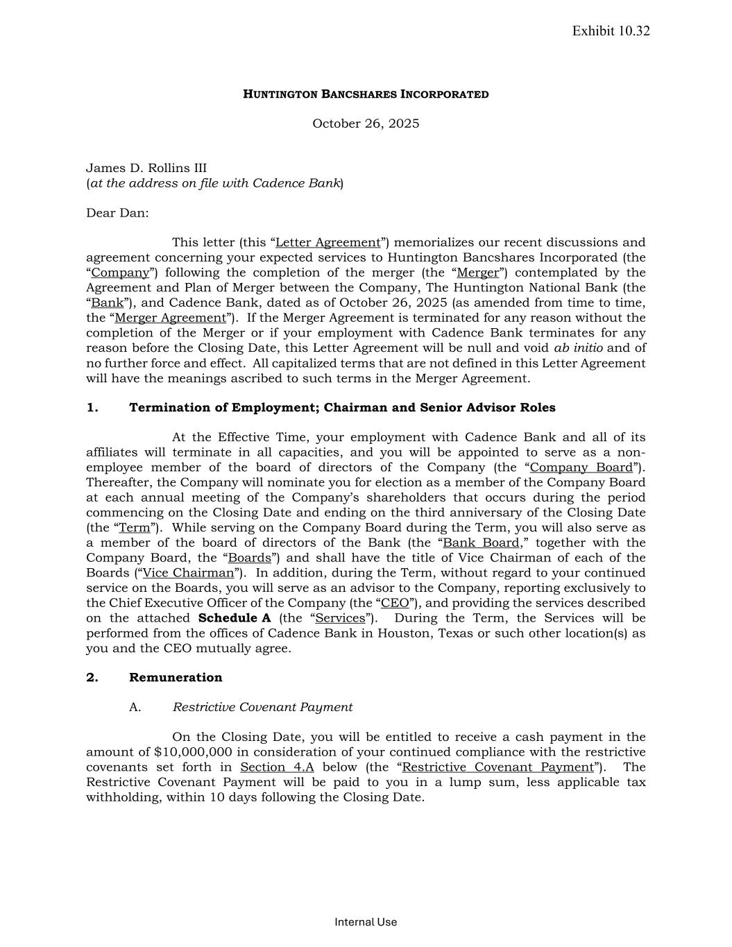 Exhibit 10.32 Internal Use HUNTINGTON BANCSHARES INCORPORATED October 26, 2025 James D. Rollins III (at the address on file with Cadence Bank) Dear Dan: This letter (this “Letter Agreement”) memorializes our recent discussions and agreement concerning your expected services to Huntington Bancshares Incorporated (the “Company”) following the completion of the merger (the “Merger”) contemplated by the Agreement and Plan of Merger between the Company, The Huntington National Bank (the “Bank”), and Cadence Bank, dated as of October 26, 2025 (as amended from time to time, the “Merger Agreement”). If the Merger Agreement is terminated for any reason without the completion of the Merger or if your employment with Cadence Bank terminates for any reason before the Closing Date, this Letter Agreement will be null and void ab initio and of no further force and effect. All capitalized terms that are not defined in this Letter Agreement will have the meanings ascribed to such terms in the Merger Agreement. 1. Termination of Employment; Chairman and Senior Advisor Roles At the Effective Time, your employment with Cadence Bank and all of its affiliates will terminate in all capacities, and you will be appointed to serve as a non- employee member of the board of directors of the Company (the “Company Board”). Thereafter, the Company will nominate you for election as a member of the Company Board at each annual meeting of the Company’s shareholders that occurs during the period commencing on the Closing Date and ending on the third anniversary of the Closing Date (the “Term”). While serving on the Company Board during the Term, you will also serve as a member of the board of directors of the Bank (the “Bank Board,” together with the Company Board, the “Boards”) and shall have the title of Vice Chairman of each of the Boards (“Vice Chairman”). In addition, during the Term, without regard to your continued service on the Boards, you will serve as an advisor to the Company, reporting exclusively to the Chief Executive Officer of the Company (the “CEO”), and providing the services described on the attached Schedule A (the “Services”). During the Term, the Services will be performed from the offices of Cadence Bank in Houston, Texas or such other location(s) as you and the CEO mutually agree. 2. Remuneration A. Restrictive Covenant Payment On the Closing Date, you will be entitled to receive a cash payment in the amount of $10,000,000 in consideration of your continued compliance with the restrictive covenants set forth in Section 4.A below (the “Restrictive Covenant Payment”). The Restrictive Covenant Payment will be paid to you in a lump sum, less applicable tax withholding, within 10 days following the Closing Date.