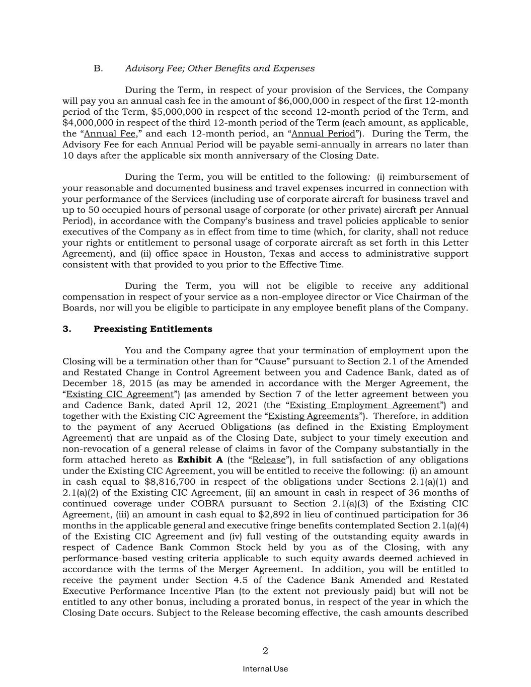 2 Internal Use B. Advisory Fee; Other Benefits and Expenses During the Term, in respect of your provision of the Services, the Company will pay you an annual cash fee in the amount of $6,000,000 in respect of the first 12-month period of the Term, $5,000,000 in respect of the second 12-month period of the Term, and $4,000,000 in respect of the third 12-month period of the Term (each amount, as applicable, the “Annual Fee,” and each 12-month period, an “Annual Period”). During the Term, the Advisory Fee for each Annual Period will be payable semi-annually in arrears no later than 10 days after the applicable six month anniversary of the Closing Date. During the Term, you will be entitled to the following: (i) reimbursement of your reasonable and documented business and travel expenses incurred in connection with your performance of the Services (including use of corporate aircraft for business travel and up to 50 occupied hours of personal usage of corporate (or other private) aircraft per Annual Period), in accordance with the Company’s business and travel policies applicable to senior executives of the Company as in effect from time to time (which, for clarity, shall not reduce your rights or entitlement to personal usage of corporate aircraft as set forth in this Letter Agreement), and (ii) office space in Houston, Texas and access to administrative support consistent with that provided to you prior to the Effective Time. During the Term, you will not be eligible to receive any additional compensation in respect of your service as a non-employee director or Vice Chairman of the Boards, nor will you be eligible to participate in any employee benefit plans of the Company. 3. Preexisting Entitlements You and the Company agree that your termination of employment upon the Closing will be a termination other than for “Cause” pursuant to Section 2.1 of the Amended and Restated Change in Control Agreement between you and Cadence Bank, dated as of December 18, 2015 (as may be amended in accordance with the Merger Agreement, the “Existing CIC Agreement”) (as amended by Section 7 of the letter agreement between you and Cadence Bank, dated April 12, 2021 (the “Existing Employment Agreement”) and together with the Existing CIC Agreement the “Existing Agreements”). Therefore, in addition to the payment of any Accrued Obligations (as defined in the Existing Employment Agreement) that are unpaid as of the Closing Date, subject to your timely execution and non-revocation of a general release of claims in favor of the Company substantially in the form attached hereto as Exhibit A (the “Release”), in full satisfaction of any obligations under the Existing CIC Agreement, you will be entitled to receive the following: (i) an amount in cash equal to $8,816,700 in respect of the obligations under Sections 2.1(a)(1) and 2.1(a)(2) of the Existing CIC Agreement, (ii) an amount in cash in respect of 36 months of continued coverage under COBRA pursuant to Section 2.1(a)(3) of the Existing CIC Agreement, (iii) an amount in cash equal to $2,892 in lieu of continued participation for 36 months in the applicable general and executive fringe benefits contemplated Section 2.1(a)(4) of the Existing CIC Agreement and (iv) full vesting of the outstanding equity awards in respect of Cadence Bank Common Stock held by you as of the Closing, with any performance-based vesting criteria applicable to such equity awards deemed achieved in accordance with the terms of the Merger Agreement. In addition, you will be entitled to receive the payment under Section 4.5 of the Cadence Bank Amended and Restated Executive Performance Incentive Plan (to the extent not previously paid) but will not be entitled to any other bonus, including a prorated bonus, in respect of the year in which the Closing Date occurs. Subject to the Release becoming effective, the cash amounts described
