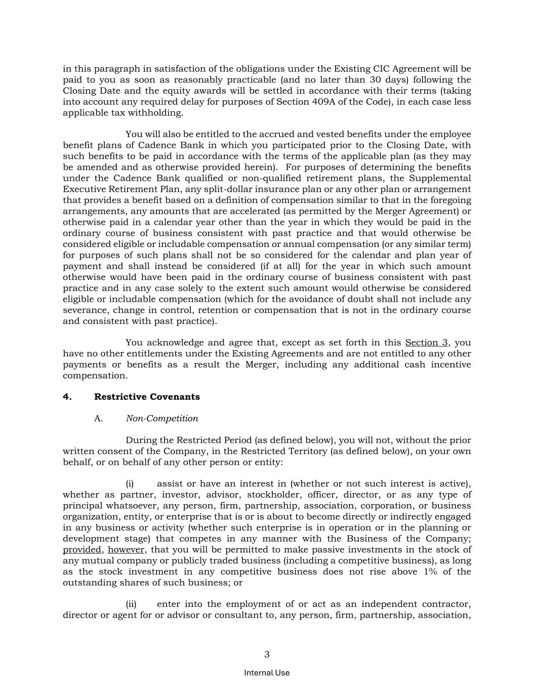 3 Internal Use in this paragraph in satisfaction of the obligations under the Existing CIC Agreement will be paid to you as soon as reasonably practicable (and no later than 30 days) following the Closing Date and the equity awards will be settled in accordance with their terms (taking into account any required delay for purposes of Section 409A of the Code), in each case less applicable tax withholding. You will also be entitled to the accrued and vested benefits under the employee benefit plans of Cadence Bank in which you participated prior to the Closing Date, with such benefits to be paid in accordance with the terms of the applicable plan (as they may be amended and as otherwise provided herein). For purposes of determining the benefits under the Cadence Bank qualified or non-qualified retirement plans, the Supplemental Executive Retirement Plan, any split-dollar insurance plan or any other plan or arrangement that provides a benefit based on a definition of compensation similar to that in the foregoing arrangements, any amounts that are accelerated (as permitted by the Merger Agreement) or otherwise paid in a calendar year other than the year in which they would be paid in the ordinary course of business consistent with past practice and that would otherwise be considered eligible or includable compensation or annual compensation (or any similar term) for purposes of such plans shall not be so considered for the calendar and plan year of payment and shall instead be considered (if at all) for the year in which such amount otherwise would have been paid in the ordinary course of business consistent with past practice and in any case solely to the extent such amount would otherwise be considered eligible or includable compensation (which for the avoidance of doubt shall not include any severance, change in control, retention or compensation that is not in the ordinary course and consistent with past practice). You acknowledge and agree that, except as set forth in this Section 3, you have no other entitlements under the Existing Agreements and are not entitled to any other payments or benefits as a result the Merger, including any additional cash incentive compensation. 4. Restrictive Covenants A. Non-Competition During the Restricted Period (as defined below), you will not, without the prior written consent of the Company, in the Restricted Territory (as defined below), on your own behalf, or on behalf of any other person or entity: (i) assist or have an interest in (whether or not such interest is active), whether as partner, investor, advisor, stockholder, officer, director, or as any type of principal whatsoever, any person, firm, partnership, association, corporation, or business organization, entity, or enterprise that is or is about to become directly or indirectly engaged in any business or activity (whether such enterprise is in operation or in the planning or development stage) that competes in any manner with the Business of the Company; provided, however, that you will be permitted to make passive investments in the stock of any mutual company or publicly traded business (including a competitive business), as long as the stock investment in any competitive business does not rise above 1% of the outstanding shares of such business; or (ii) enter into the employment of or act as an independent contractor, director or agent for or advisor or consultant to, any person, firm, partnership, association,