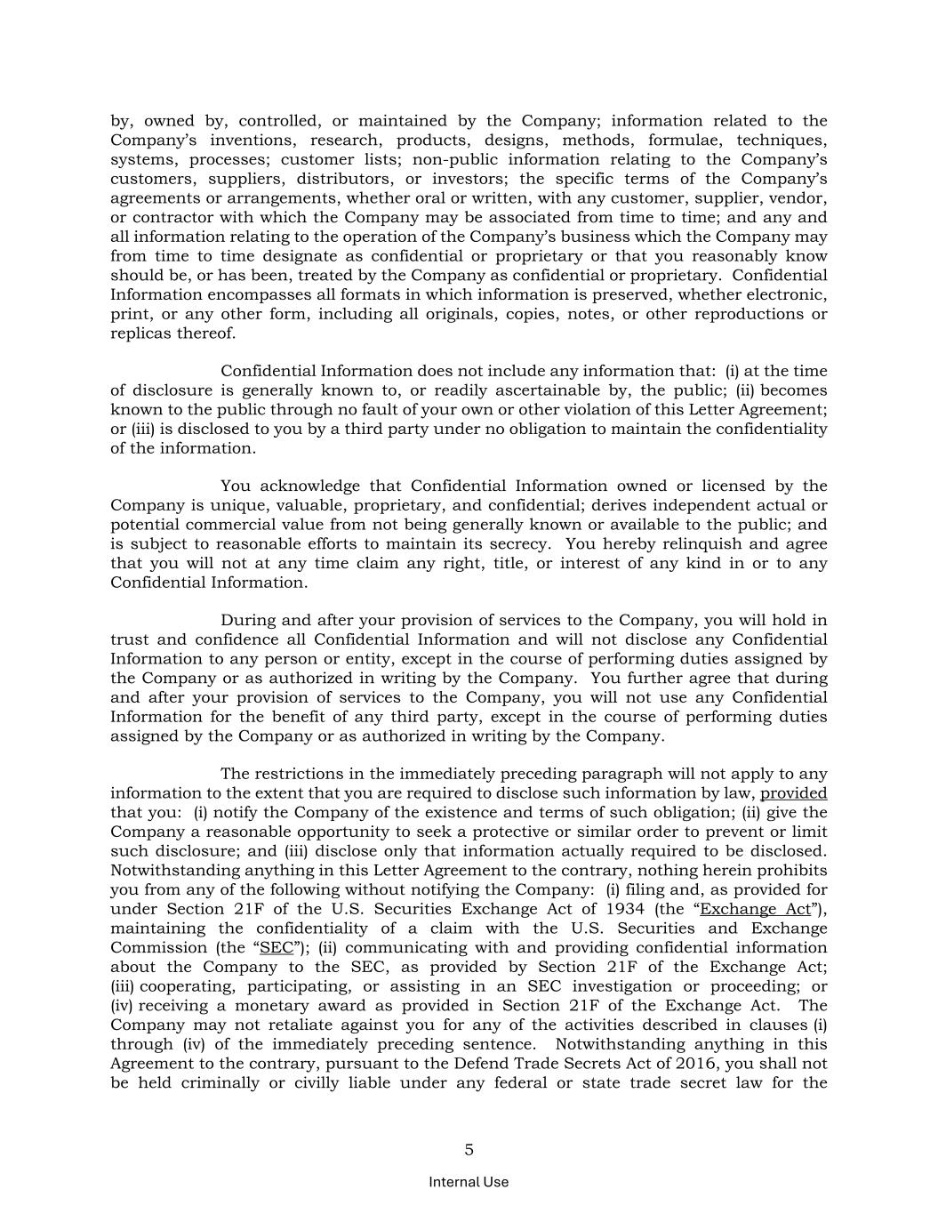 5 Internal Use by, owned by, controlled, or maintained by the Company; information related to the Company’s inventions, research, products, designs, methods, formulae, techniques, systems, processes; customer lists; non-public information relating to the Company’s customers, suppliers, distributors, or investors; the specific terms of the Company’s agreements or arrangements, whether oral or written, with any customer, supplier, vendor, or contractor with which the Company may be associated from time to time; and any and all information relating to the operation of the Company’s business which the Company may from time to time designate as confidential or proprietary or that you reasonably know should be, or has been, treated by the Company as confidential or proprietary. Confidential Information encompasses all formats in which information is preserved, whether electronic, print, or any other form, including all originals, copies, notes, or other reproductions or replicas thereof. Confidential Information does not include any information that: (i) at the time of disclosure is generally known to, or readily ascertainable by, the public; (ii) becomes known to the public through no fault of your own or other violation of this Letter Agreement; or (iii) is disclosed to you by a third party under no obligation to maintain the confidentiality of the information. You acknowledge that Confidential Information owned or licensed by the Company is unique, valuable, proprietary, and confidential; derives independent actual or potential commercial value from not being generally known or available to the public; and is subject to reasonable efforts to maintain its secrecy. You hereby relinquish and agree that you will not at any time claim any right, title, or interest of any kind in or to any Confidential Information. During and after your provision of services to the Company, you will hold in trust and confidence all Confidential Information and will not disclose any Confidential Information to any person or entity, except in the course of performing duties assigned by the Company or as authorized in writing by the Company. You further agree that during and after your provision of services to the Company, you will not use any Confidential Information for the benefit of any third party, except in the course of performing duties assigned by the Company or as authorized in writing by the Company. The restrictions in the immediately preceding paragraph will not apply to any information to the extent that you are required to disclose such information by law, provided that you: (i) notify the Company of the existence and terms of such obligation; (ii) give the Company a reasonable opportunity to seek a protective or similar order to prevent or limit such disclosure; and (iii) disclose only that information actually required to be disclosed. Notwithstanding anything in this Letter Agreement to the contrary, nothing herein prohibits you from any of the following without notifying the Company: (i) filing and, as provided for under Section 21F of the U.S. Securities Exchange Act of 1934 (the “Exchange Act”), maintaining the confidentiality of a claim with the U.S. Securities and Exchange Commission (the “SEC”); (ii) communicating with and providing confidential information about the Company to the SEC, as provided by Section 21F of the Exchange Act; (iii) cooperating, participating, or assisting in an SEC investigation or proceeding; or (iv) receiving a monetary award as provided in Section 21F of the Exchange Act. The Company may not retaliate against you for any of the activities described in clauses (i) through (iv) of the immediately preceding sentence. Notwithstanding anything in this Agreement to the contrary, pursuant to the Defend Trade Secrets Act of 2016, you shall not be held criminally or civilly liable under any federal or state trade secret law for the