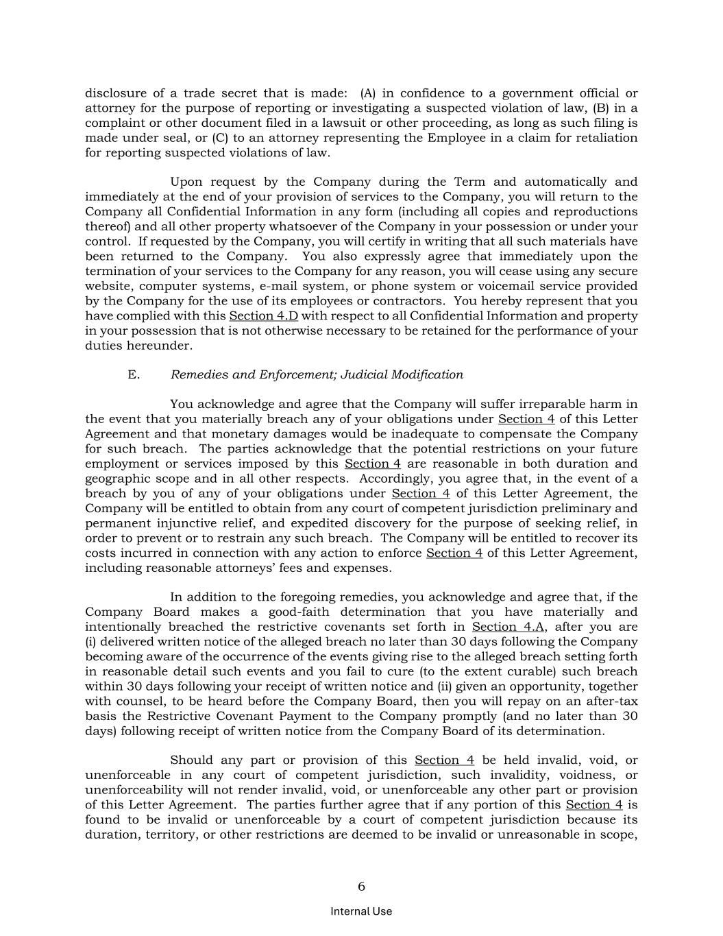 6 Internal Use disclosure of a trade secret that is made: (A) in confidence to a government official or attorney for the purpose of reporting or investigating a suspected violation of law, (B) in a complaint or other document filed in a lawsuit or other proceeding, as long as such filing is made under seal, or (C) to an attorney representing the Employee in a claim for retaliation for reporting suspected violations of law. Upon request by the Company during the Term and automatically and immediately at the end of your provision of services to the Company, you will return to the Company all Confidential Information in any form (including all copies and reproductions thereof) and all other property whatsoever of the Company in your possession or under your control. If requested by the Company, you will certify in writing that all such materials have been returned to the Company. You also expressly agree that immediately upon the termination of your services to the Company for any reason, you will cease using any secure website, computer systems, e-mail system, or phone system or voicemail service provided by the Company for the use of its employees or contractors. You hereby represent that you have complied with this Section 4.D with respect to all Confidential Information and property in your possession that is not otherwise necessary to be retained for the performance of your duties hereunder. E. Remedies and Enforcement; Judicial Modification You acknowledge and agree that the Company will suffer irreparable harm in the event that you materially breach any of your obligations under Section 4 of this Letter Agreement and that monetary damages would be inadequate to compensate the Company for such breach. The parties acknowledge that the potential restrictions on your future employment or services imposed by this Section 4 are reasonable in both duration and geographic scope and in all other respects. Accordingly, you agree that, in the event of a breach by you of any of your obligations under Section 4 of this Letter Agreement, the Company will be entitled to obtain from any court of competent jurisdiction preliminary and permanent injunctive relief, and expedited discovery for the purpose of seeking relief, in order to prevent or to restrain any such breach. The Company will be entitled to recover its costs incurred in connection with any action to enforce Section 4 of this Letter Agreement, including reasonable attorneys’ fees and expenses. In addition to the foregoing remedies, you acknowledge and agree that, if the Company Board makes a good-faith determination that you have materially and intentionally breached the restrictive covenants set forth in Section 4.A, after you are (i) delivered written notice of the alleged breach no later than 30 days following the Company becoming aware of the occurrence of the events giving rise to the alleged breach setting forth in reasonable detail such events and you fail to cure (to the extent curable) such breach within 30 days following your receipt of written notice and (ii) given an opportunity, together with counsel, to be heard before the Company Board, then you will repay on an after-tax basis the Restrictive Covenant Payment to the Company promptly (and no later than 30 days) following receipt of written notice from the Company Board of its determination. Should any part or provision of this Section 4 be held invalid, void, or unenforceable in any court of competent jurisdiction, such invalidity, voidness, or unenforceability will not render invalid, void, or unenforceable any other part or provision of this Letter Agreement. The parties further agree that if any portion of this Section 4 is found to be invalid or unenforceable by a court of competent jurisdiction because its duration, territory, or other restrictions are deemed to be invalid or unreasonable in scope,