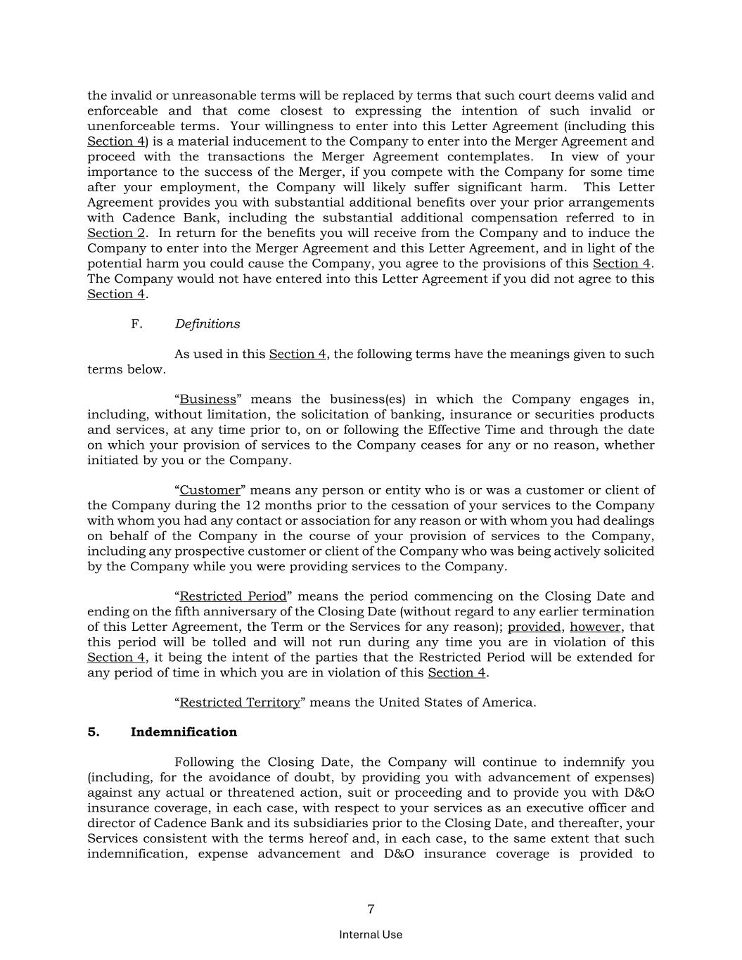 7 Internal Use the invalid or unreasonable terms will be replaced by terms that such court deems valid and enforceable and that come closest to expressing the intention of such invalid or unenforceable terms. Your willingness to enter into this Letter Agreement (including this Section 4) is a material inducement to the Company to enter into the Merger Agreement and proceed with the transactions the Merger Agreement contemplates. In view of your importance to the success of the Merger, if you compete with the Company for some time after your employment, the Company will likely suffer significant harm. This Letter Agreement provides you with substantial additional benefits over your prior arrangements with Cadence Bank, including the substantial additional compensation referred to in Section 2. In return for the benefits you will receive from the Company and to induce the Company to enter into the Merger Agreement and this Letter Agreement, and in light of the potential harm you could cause the Company, you agree to the provisions of this Section 4. The Company would not have entered into this Letter Agreement if you did not agree to this Section 4. F. Definitions As used in this Section 4, the following terms have the meanings given to such terms below. “Business” means the business(es) in which the Company engages in, including, without limitation, the solicitation of banking, insurance or securities products and services, at any time prior to, on or following the Effective Time and through the date on which your provision of services to the Company ceases for any or no reason, whether initiated by you or the Company. “Customer” means any person or entity who is or was a customer or client of the Company during the 12 months prior to the cessation of your services to the Company with whom you had any contact or association for any reason or with whom you had dealings on behalf of the Company in the course of your provision of services to the Company, including any prospective customer or client of the Company who was being actively solicited by the Company while you were providing services to the Company. “Restricted Period” means the period commencing on the Closing Date and ending on the fifth anniversary of the Closing Date (without regard to any earlier termination of this Letter Agreement, the Term or the Services for any reason); provided, however, that this period will be tolled and will not run during any time you are in violation of this Section 4, it being the intent of the parties that the Restricted Period will be extended for any period of time in which you are in violation of this Section 4. “Restricted Territory” means the United States of America. 5. Indemnification Following the Closing Date, the Company will continue to indemnify you (including, for the avoidance of doubt, by providing you with advancement of expenses) against any actual or threatened action, suit or proceeding and to provide you with D&O insurance coverage, in each case, with respect to your services as an executive officer and director of Cadence Bank and its subsidiaries prior to the Closing Date, and thereafter, your Services consistent with the terms hereof and, in each case, to the same extent that such indemnification, expense advancement and D&O insurance coverage is provided to