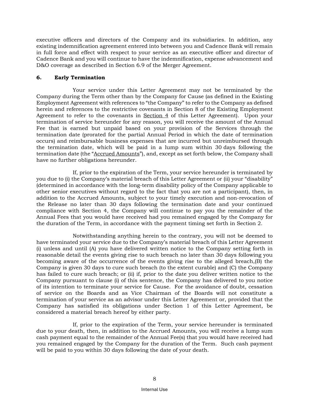8 Internal Use executive officers and directors of the Company and its subsidiaries. In addition, any existing indemnification agreement entered into between you and Cadence Bank will remain in full force and effect with respect to your service as an executive officer and director of Cadence Bank and you will continue to have the indemnification, expense advancement and D&O coverage as described in Section 6.9 of the Merger Agreement. 6. Early Termination Your service under this Letter Agreement may not be terminated by the Company during the Term other than by the Company for Cause (as defined in the Existing Employment Agreement with references to “the Company” to refer to the Company as defined herein and references to the restrictive covenants in Section 8 of the Existing Employment Agreement to refer to the covenants in Section 4 of this Letter Agreement). Upon your termination of service hereunder for any reason, you will receive the amount of the Annual Fee that is earned but unpaid based on your provision of the Services through the termination date (prorated for the partial Annual Period in which the date of termination occurs) and reimbursable business expenses that are incurred but unreimbursed through the termination date, which will be paid in a lump sum within 30 days following the termination date (the “Accrued Amounts”), and, except as set forth below, the Company shall have no further obligations hereunder. If, prior to the expiration of the Term, your service hereunder is terminated by you due to (i) the Company’s material breach of this Letter Agreement or (ii) your “disability” (determined in accordance with the long-term disability policy of the Company applicable to other senior executives without regard to the fact that you are not a participant), then, in addition to the Accrued Amounts, subject to your timely execution and non-revocation of the Release no later than 30 days following the termination date and your continued compliance with Section 4, the Company will continue to pay you the remainder of the Annual Fees that you would have received had you remained engaged by the Company for the duration of the Term, in accordance with the payment timing set forth in Section 2. Notwithstanding anything herein to the contrary, you will not be deemed to have terminated your service due to the Company’s material breach of this Letter Agreement (i) unless and until (A) you have delivered written notice to the Company setting forth in reasonable detail the events giving rise to such breach no later than 30 days following you becoming aware of the occurrence of the events giving rise to the alleged breach,(B) the Company is given 30 days to cure such breach (to the extent curable) and (C) the Company has failed to cure such breach; or (ii) if, prior to the date you deliver written notice to the Company pursuant to clause (i) of this sentence, the Company has delivered to you notice of its intention to terminate your service for Cause. For the avoidance of doubt, cessation of service on the Boards and as Vice Chairman of the Boards will not constitute a termination of your service as an advisor under this Letter Agreement or, provided that the Company has satisfied its obligations under Section 1 of this Letter Agreement, be considered a material breach hereof by either party. If, prior to the expiration of the Term, your service hereunder is terminated due to your death, then, in addition to the Accrued Amounts, you will receive a lump sum cash payment equal to the remainder of the Annual Fee(s) that you would have received had you remained engaged by the Company for the duration of the Term. Such cash payment will be paid to you within 30 days following the date of your death.