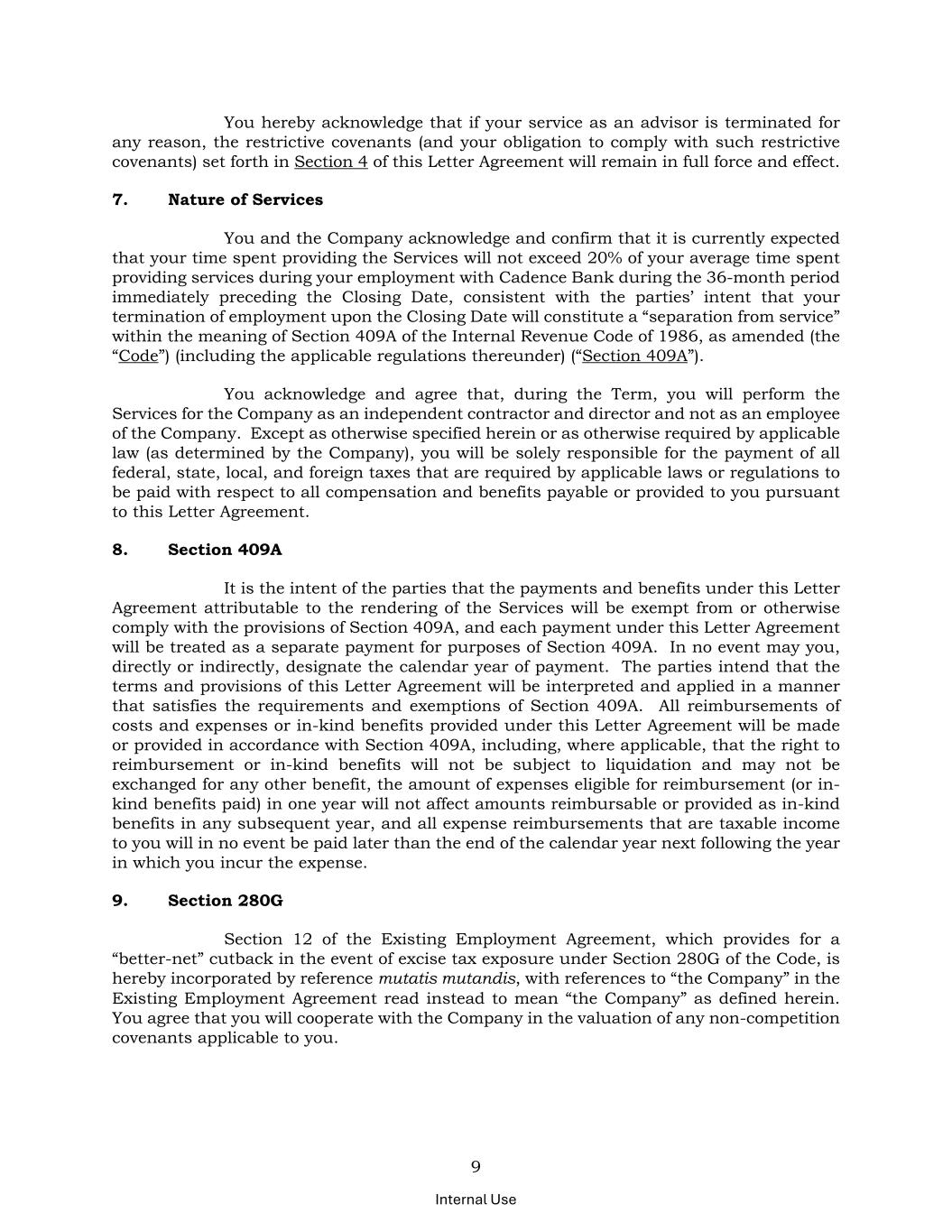 9 Internal Use You hereby acknowledge that if your service as an advisor is terminated for any reason, the restrictive covenants (and your obligation to comply with such restrictive covenants) set forth in Section 4 of this Letter Agreement will remain in full force and effect. 7. Nature of Services You and the Company acknowledge and confirm that it is currently expected that your time spent providing the Services will not exceed 20% of your average time spent providing services during your employment with Cadence Bank during the 36-month period immediately preceding the Closing Date, consistent with the parties’ intent that your termination of employment upon the Closing Date will constitute a “separation from service” within the meaning of Section 409A of the Internal Revenue Code of 1986, as amended (the “Code”) (including the applicable regulations thereunder) (“Section 409A”). You acknowledge and agree that, during the Term, you will perform the Services for the Company as an independent contractor and director and not as an employee of the Company. Except as otherwise specified herein or as otherwise required by applicable law (as determined by the Company), you will be solely responsible for the payment of all federal, state, local, and foreign taxes that are required by applicable laws or regulations to be paid with respect to all compensation and benefits payable or provided to you pursuant to this Letter Agreement. 8. Section 409A It is the intent of the parties that the payments and benefits under this Letter Agreement attributable to the rendering of the Services will be exempt from or otherwise comply with the provisions of Section 409A, and each payment under this Letter Agreement will be treated as a separate payment for purposes of Section 409A. In no event may you, directly or indirectly, designate the calendar year of payment. The parties intend that the terms and provisions of this Letter Agreement will be interpreted and applied in a manner that satisfies the requirements and exemptions of Section 409A. All reimbursements of costs and expenses or in-kind benefits provided under this Letter Agreement will be made or provided in accordance with Section 409A, including, where applicable, that the right to reimbursement or in-kind benefits will not be subject to liquidation and may not be exchanged for any other benefit, the amount of expenses eligible for reimbursement (or in- kind benefits paid) in one year will not affect amounts reimbursable or provided as in-kind benefits in any subsequent year, and all expense reimbursements that are taxable income to you will in no event be paid later than the end of the calendar year next following the year in which you incur the expense. 9. Section 280G Section 12 of the Existing Employment Agreement, which provides for a “better-net” cutback in the event of excise tax exposure under Section 280G of the Code, is hereby incorporated by reference mutatis mutandis, with references to “the Company” in the Existing Employment Agreement read instead to mean “the Company” as defined herein. You agree that you will cooperate with the Company in the valuation of any non-competition covenants applicable to you.