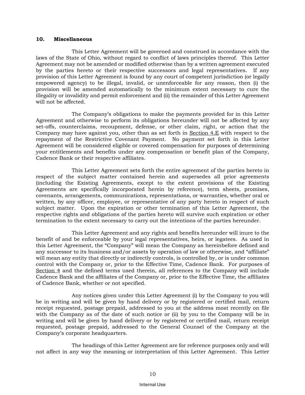 10 Internal Use 10. Miscellaneous This Letter Agreement will be governed and construed in accordance with the laws of the State of Ohio, without regard to conflict of laws principles thereof. This Letter Agreement may not be amended or modified otherwise than by a written agreement executed by the parties hereto or their respective successors and legal representatives. If any provision of this Letter Agreement is found by any court of competent jurisdiction (or legally empowered agency) to be illegal, invalid, or unenforceable for any reason, then (i) the provision will be amended automatically to the minimum extent necessary to cure the illegality or invalidity and permit enforcement and (ii) the remainder of this Letter Agreement will not be affected. The Company’s obligations to make the payments provided for in this Letter Agreement and otherwise to perform its obligations hereunder will not be affected by any set-offs, counterclaims, recoupment, defense, or other claim, right, or action that the Company may have against you, other than as set forth in Section 4.E with respect to the repayment of the Restrictive Covenant Payment. No payment set forth in this Letter Agreement will be considered eligible or covered compensation for purposes of determining your entitlements and benefits under any compensation or benefit plan of the Company, Cadence Bank or their respective affiliates. This Letter Agreement sets forth the entire agreement of the parties hereto in respect of the subject matter contained herein and supersedes all prior agreements (including the Existing Agreements, except to the extent provisions of the Existing Agreements are specifically incorporated herein by reference), term sheets, promises, covenants, arrangements, communications, representations, or warranties, whether oral or written, by any officer, employee, or representative of any party hereto in respect of such subject matter. Upon the expiration or other termination of this Letter Agreement, the respective rights and obligations of the parties hereto will survive such expiration or other termination to the extent necessary to carry out the intentions of the parties hereunder. This Letter Agreement and any rights and benefits hereunder will inure to the benefit of and be enforceable by your legal representatives, heirs, or legatees. As used in this Letter Agreement, the “Company” will mean the Company as hereinbefore defined and any successor to its business and/or assets by operation of law or otherwise, and “affiliate” will mean any entity that directly or indirectly controls, is controlled by, or is under common control with the Company or, prior to the Effective Time, Cadence Bank. For purposes of Section 4 and the defined terms used therein, all references to the Company will include Cadence Bank and the affiliates of the Company or, prior to the Effective Time, the affiliates of Cadence Bank, whether or not specified. Any notices given under this Letter Agreement (i) by the Company to you will be in writing and will be given by hand delivery or by registered or certified mail, return receipt requested, postage prepaid, addressed to you at the address most recently on file with the Company as of the date of such notice or (ii) by you to the Company will be in writing and will be given by hand delivery or by registered or certified mail, return receipt requested, postage prepaid, addressed to the General Counsel of the Company at the Company’s corporate headquarters. The headings of this Letter Agreement are for reference purposes only and will not affect in any way the meaning or interpretation of this Letter Agreement. This Letter