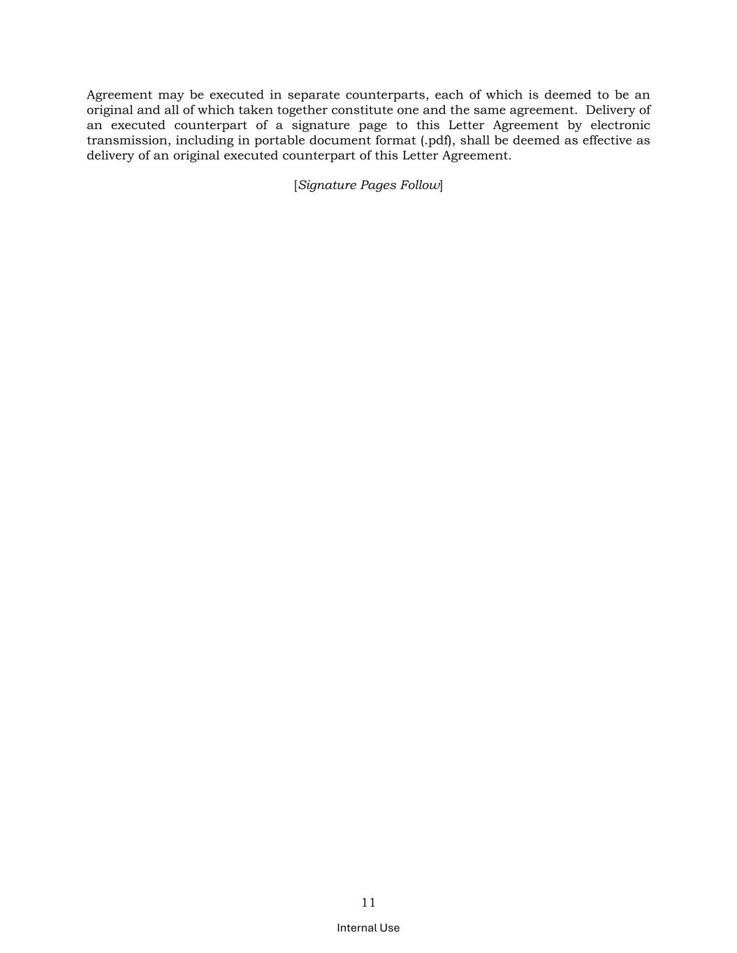 11 Internal Use Agreement may be executed in separate counterparts, each of which is deemed to be an original and all of which taken together constitute one and the same agreement. Delivery of an executed counterpart of a signature page to this Letter Agreement by electronic transmission, including in portable document format (.pdf), shall be deemed as effective as delivery of an original executed counterpart of this Letter Agreement. [Signature Pages Follow]