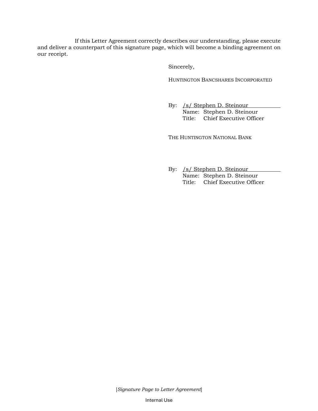 [Signature Page to Letter Agreement] Internal Use If this Letter Agreement correctly describes our understanding, please execute and deliver a counterpart of this signature page, which will become a binding agreement on our receipt. Sincerely, HUNTINGTON BANCSHARES INCORPORATED By: /s/ Stephen D. Steinour Name: Stephen D. Steinour Title: Chief Executive Officer THE HUNTINGTON NATIONAL BANK By: /s/ Stephen D. Steinour Name: Stephen D. Steinour Title: Chief Executive Officer