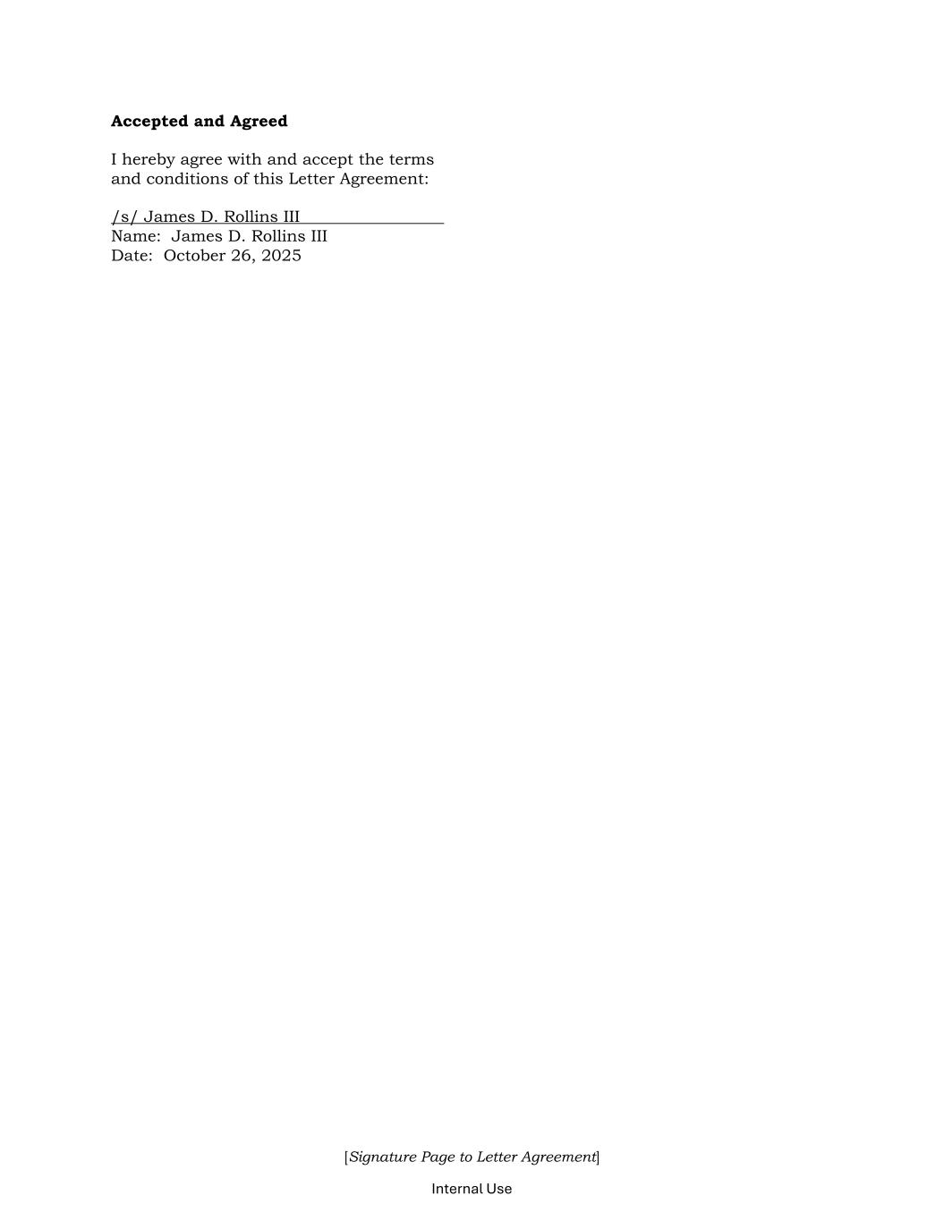 [Signature Page to Letter Agreement] Internal Use Accepted and Agreed I hereby agree with and accept the terms and conditions of this Letter Agreement: /s/ James D. Rollins III Name: James D. Rollins III Date: October 26, 2025