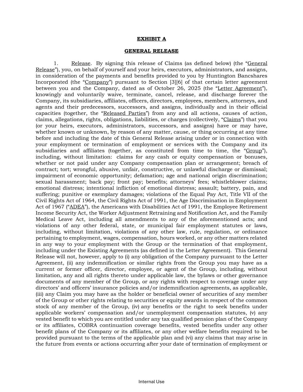 Internal Use EXHIBIT A GENERAL RELEASE 1. Release. By signing this release of Claims (as defined below) (the “General Release”), you, on behalf of yourself and your heirs, executors, administrators, and assigns, in consideration of the payments and benefits provided to you by Huntington Bancshares Incorporated (the “Company”) pursuant to Section [3][6] of that certain letter agreement between you and the Company, dated as of October 26, 2025 (the “Letter Agreement”), knowingly and voluntarily waive, terminate, cancel, release, and discharge forever the Company, its subsidiaries, affiliates, officers, directors, employees, members, attorneys, and agents and their predecessors, successors, and assigns, individually and in their official capacities (together, the “Released Parties”) from any and all actions, causes of action, claims, allegations, rights, obligations, liabilities, or charges (collectively, “Claims”) that you (or your heirs, executors, administrators, successors, and assigns) have or may have, whether known or unknown, by reason of any matter, cause, or thing occurring at any time before and including the date of this General Release arising under or in connection with your employment or termination of employment or services with the Company and its subsidiaries and affiliates (together, as constituted from time to time, the “Group”), including, without limitation: claims for any cash or equity compensation or bonuses, whether or not paid under any Company compensation plan or arrangement; breach of contract; tort; wrongful, abusive, unfair, constructive, or unlawful discharge or dismissal; impairment of economic opportunity; defamation; age and national origin discrimination; sexual harassment; back pay; front pay; benefits; attorneys’ fees; whistleblower claims; emotional distress; intentional infliction of emotional distress; assault; battery, pain, and suffering; punitive or exemplary damages; violations of the Equal Pay Act, Title VII of the Civil Rights Act of 1964, the Civil Rights Act of 1991, the Age Discrimination in Employment Act of 1967 (“ADEA”), the Americans with Disabilities Act of 1991, the Employee Retirement Income Security Act, the Worker Adjustment Retraining and Notification Act, and the Family Medical Leave Act, including all amendments to any of the aforementioned acts; and violations of any other federal, state, or municipal fair employment statutes or laws, including, without limitation, violations of any other law, rule, regulation, or ordinance pertaining to employment, wages, compensation, hours worked, or any other matters related in any way to your employment with the Group or the termination of that employment, including under the Existing Agreements (as defined in the Letter Agreement). This General Release will not, however, apply to (i) any obligation of the Company pursuant to the Letter Agreement, (ii) any indemnification or similar rights from the Group you may have as a current or former officer, director, employee, or agent of the Group, including, without limitation, any and all rights thereto under applicable law, the bylaws or other governance documents of any member of the Group, or any rights with respect to coverage under any directors’ and officers’ insurance policies and/or indemnification agreements, as applicable, (iii) any Claim you may have as the holder or beneficial owner of securities of any member of the Group or other rights relating to securities or equity awards in respect of the common stock of any member of the Group, (iv) any benefits or the right to seek benefits under applicable workers’ compensation and/or unemployment compensation statutes, (v) any vested benefit to which you are entitled under any tax qualified pension plan of the Company or its affiliates, COBRA continuation coverage benefits, vested benefits under any other benefit plans of the Company or its affiliates, or any other welfare benefits required to be provided pursuant to the terms of the applicable plan and (vi) any claims that may arise in the future from events or actions occurring after your date of termination of employment or