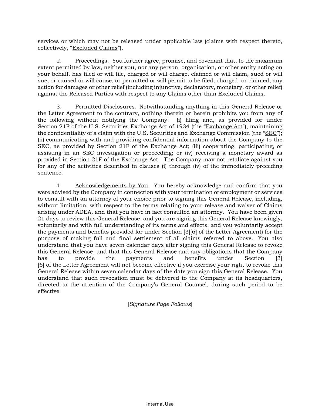Internal Use services or which may not be released under applicable law (claims with respect thereto, collectively, “Excluded Claims”). 2. Proceedings. You further agree, promise, and covenant that, to the maximum extent permitted by law, neither you, nor any person, organization, or other entity acting on your behalf, has filed or will file, charged or will charge, claimed or will claim, sued or will sue, or caused or will cause, or permitted or will permit to be filed, charged, or claimed, any action for damages or other relief (including injunctive, declaratory, monetary, or other relief) against the Released Parties with respect to any Claims other than Excluded Claims. 3. Permitted Disclosures. Notwithstanding anything in this General Release or the Letter Agreement to the contrary, nothing therein or herein prohibits you from any of the following without notifying the Company: (i) filing and, as provided for under Section 21F of the U.S. Securities Exchange Act of 1934 (the “Exchange Act”), maintaining the confidentiality of a claim with the U.S. Securities and Exchange Commission (the “SEC”); (ii) communicating with and providing confidential information about the Company to the SEC, as provided by Section 21F of the Exchange Act; (iii) cooperating, participating, or assisting in an SEC investigation or proceeding; or (iv) receiving a monetary award as provided in Section 21F of the Exchange Act. The Company may not retaliate against you for any of the activities described in clauses (i) through (iv) of the immediately preceding sentence. 4. Acknowledgements by You. You hereby acknowledge and confirm that you were advised by the Company in connection with your termination of employment or services to consult with an attorney of your choice prior to signing this General Release, including, without limitation, with respect to the terms relating to your release and waiver of Claims arising under ADEA, and that you have in fact consulted an attorney. You have been given 21 days to review this General Release, and you are signing this General Release knowingly, voluntarily and with full understanding of its terms and effects, and you voluntarily accept the payments and benefits provided for under Section [3][6] of the Letter Agreement) for the purpose of making full and final settlement of all claims referred to above. You also understand that you have seven calendar days after signing this General Release to revoke this General Release, and that this General Release and any obligations that the Company has to provide the payments and benefits under Section [3] [6] of the Letter Agreement will not become effective if you exercise your right to revoke this General Release within seven calendar days of the date you sign this General Release. You understand that such revocation must be delivered to the Company at its headquarters, directed to the attention of the Company’s General Counsel, during such period to be effective. [Signature Page Follows]