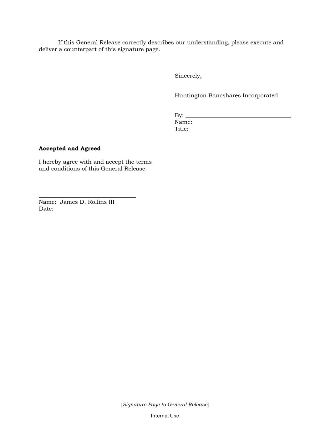 [Signature Page to General Release] Internal Use If this General Release correctly describes our understanding, please execute and deliver a counterpart of this signature page. Sincerely, Huntington Bancshares Incorporated By: Name: Title: Accepted and Agreed I hereby agree with and accept the terms and conditions of this General Release: Name: James D. Rollins III Date: