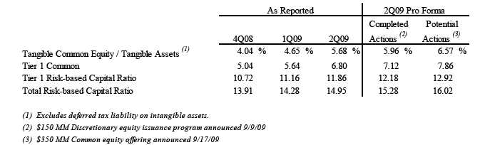 we have an opportunity to continue to build common equity efficiently to the long-term benefit of all our shareholders. We have consistently had strong regulatory capital ratios. Recently, there has been a focus on capital ratios that give greater weight to the common equity component. While the $675 million we raised in regulatory common equity has already significantly improved our Tier 1 common equity and tangible common equity ratios, this action would improve our June 30, 2009, pro forma Tier 1 common equity ratio to 7.86% and our pro forma tangible common equity ratio to 6.57%. This capital also increases our flexibility to repurchase debt and thus improve our overall funding. Further, it gives us the additional capacity to pursue growth of our core businesses, which includes supporting organic asset and deposit growth. This capital also allows us to take advantage of initiatives identified through our strategic planning effort currently underway and would significantly enhance our ability to eventually repay our $1.4 billion of TARP capital.