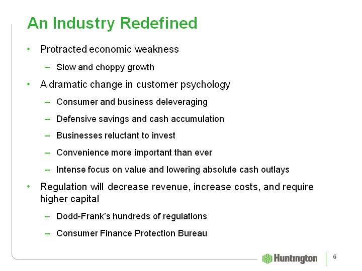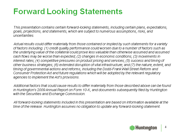 | Forward Looking Statements This presentation contains certain forward-looking statements, including certain plans, expectations, goals, projections, and statements, which are subject to numerous assumptions, risks, and uncertainties.Actual results could differ materially from those contained or implied by such statements for a variety of factors including: (1) credit quality performance could worsen due to a number of factors such as the underlying value of the collateral could prove less valuable than otherwise assumed and assumed cash flows may be worse than expected; (2) changes in economic conditions; (3) movements in interest rates; (4) competitive pressures on product pricing and services; (5) success and timing of other business strategies; (6) extended disruption of vital infrastructure; and (7) the nature, extent, and timing of governmental actions and reforms, including the Dodd-Frank Wall Street Reform and Consumer Protection Act and future regulations which will be adopted by the relevant regulatory agencies to implement the Act's provisions.Additional factors that could cause results to differ materially from those described above can be found in Huntington's 2009 Annual Report on Form 10-K, and documents subsequently filed by Huntington with the Securities and Exchange Commission.All forward-looking statements included in this presentation are based on information available at the time of the release. Huntington assumes no obligation to update any forward-looking statement. 4 |