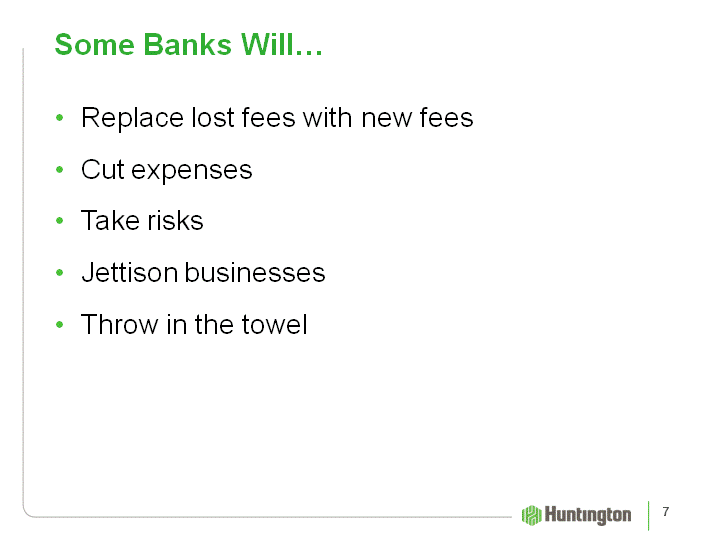 | Some Banks Will... Replace lost fees with new feesCut expensesTake risksJettison businessesThrow in the towel 7 |