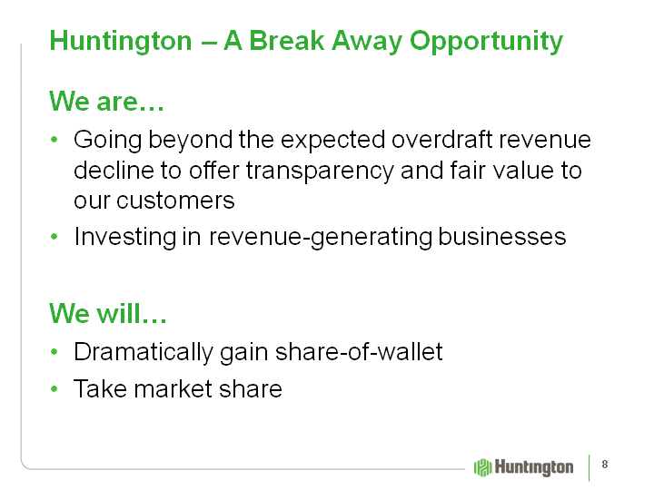 | Huntington - A Break Away Opportunity We are...Going beyond the expected overdraft revenue decline to offer transparency and fair value to our customersInvesting in revenue-generating businessesWe will...Dramatically gain share-of-walletTake market share 8 |
