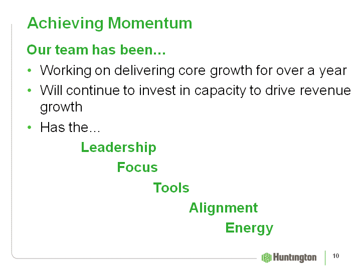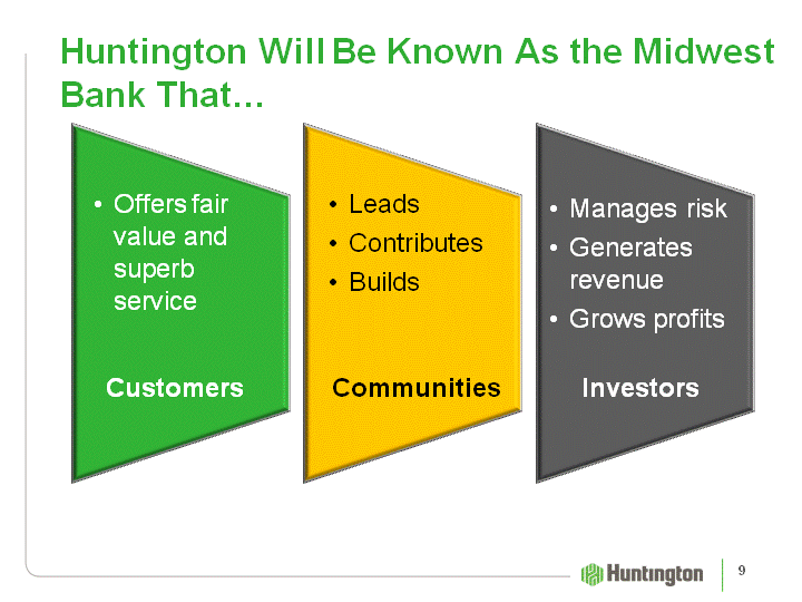 | Huntington Will Be Known As the Midwest Bank That... Offers fair value and superb service Customers LeadsContributesBuilds Communities Manages riskGenerates revenueGrows profits Investors 9 |