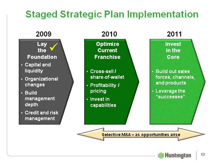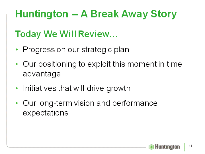 | Huntington - A Break Away Story Today We Will Review...Progress on our strategic planOur positioning to exploit this moment in time advantage Initiatives that will drive growthOur long-term vision and performance expectations 11 |