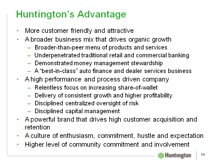 | Huntington's Advantage More customer friendly and attractiveA broader business mix that drives organic growthBroader-than-peer menu of products and servicesUnderpenetrated traditional retail and commercial bankingDemonstrated money management stewardshipA "best-in-class" auto finance and dealer services businessA high performance and process driven companyRelentless focus on increasing share-of-walletDelivery of consistent growth and higher profitabilityDisciplined centralized oversight of riskDisciplined capital managementA powerful brand that drives high customer acquisition and retentionA culture of enthusiasm, commitment, hustle and expectationHigher level of community commitment and involvement 14 |