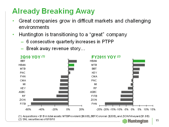 | (CHART) Already Breaking Away Great companies grow in difficult markets and challenging environmentsHuntington is transitioning to a "great" company6 consecutive quarterly increases in PTPPBreak away revenue story... Acquisitions > $1 B in total assets: MTB/Provident ($6.6 B), BBT/Colonial ($20 B), and ZION/Vineyard ($1.8 B)SNL securities as of 8/18/10 (CHART) 2Q10 YOY (1) FY2011 YOY (2) 15 |