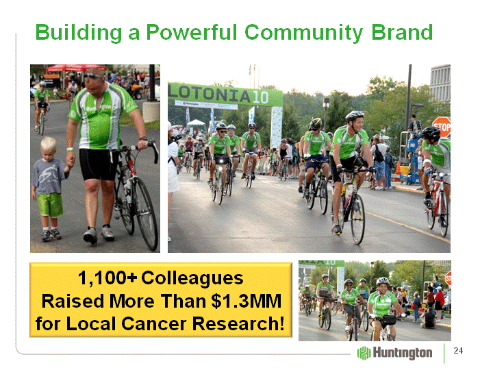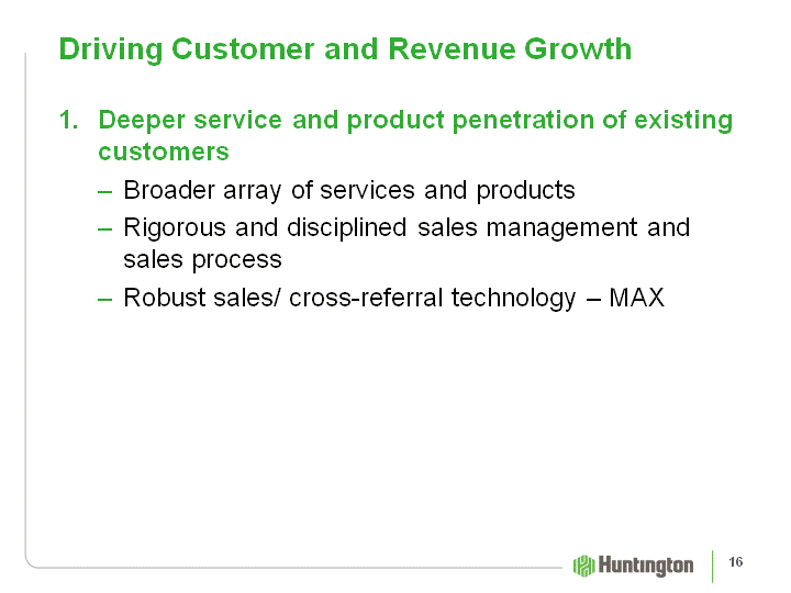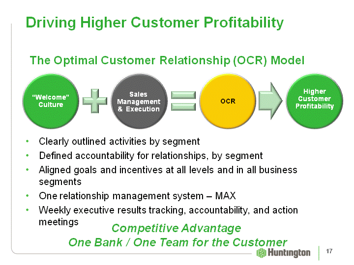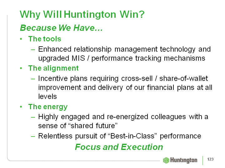 | Why Will Huntington Win? Because We Have...The toolsEnhanced relationship management technology and upgraded MIS / performance tracking mechanismsThe alignmentIncentive plans requiring cross-sell / share-of-wallet improvement and delivery of our financial plans at all levelsThe energyHighly engaged and re-energized colleagues with a sense of "shared future"Relentless pursuit of "Best-in-Class" performanceFocus and Execution 123 |
