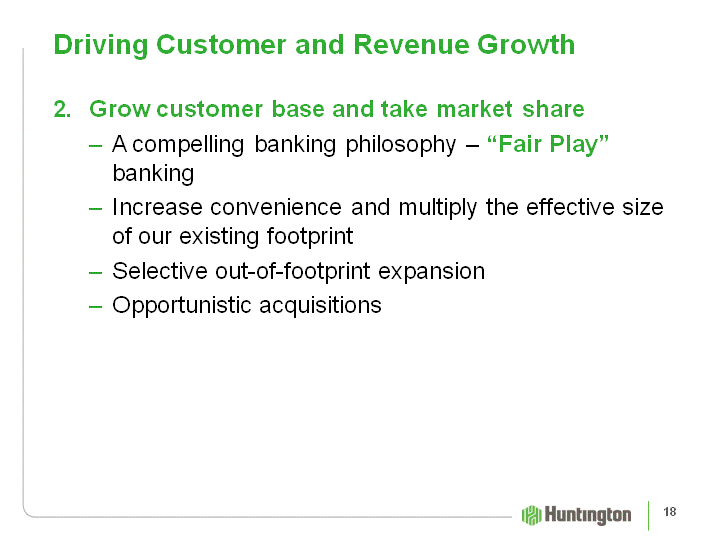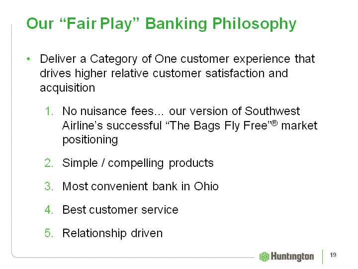 | Driving Customer and Revenue Growth Grow customer base and take market shareA compelling banking philosophy - "Fair Play" bankingIncrease convenience and multiply the effective size of our existing footprintSelective out-of-footprint expansionOpportunistic acquisitions 18 |