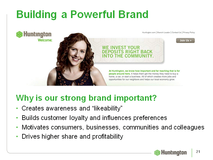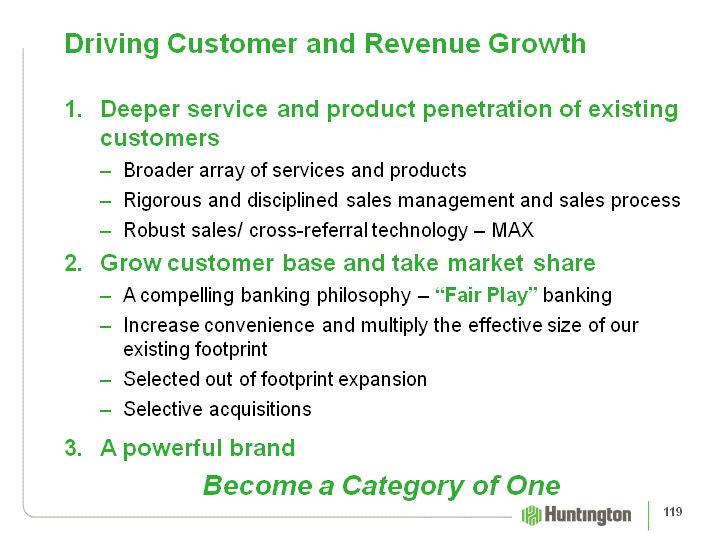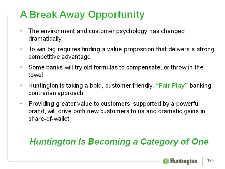 | A Break Away Opportunity The environment and customer psychology has changed dramaticallyTo win big requires finding a value proposition that delivers a strong competitive advantageSome banks will try old formulas to compensate, or throw in the towelHuntington is taking a bold, customer friendly, "Fair Play" banking contrarian approachProviding greater value to customers, supported by a powerful brand, will drive both new customers to us and dramatic gains in share-of-walletHuntington Is Becoming a Category of One 120 |