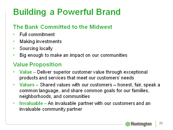 | Building a Powerful Brand The Bank Committed to the MidwestFull commitmentMaking investmentsSourcing locallyBig enough to make an impact on our communitiesValue PropositionValue - Deliver superior customer value through exceptional products and services that meet our customers' needsValues - Shared values with our customers - honest, fair, speak a common language, and share common goals for our families, neighborhoods, and communitiesInvaluable - An invaluable partner with our customers and an invaluable community partner 22 |