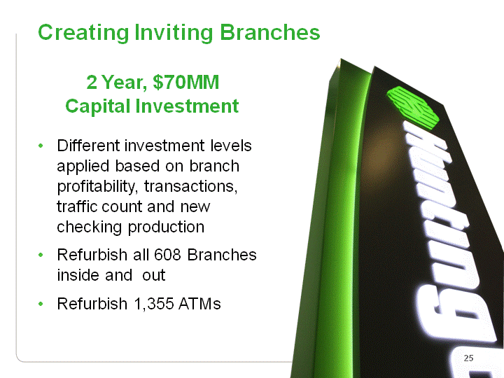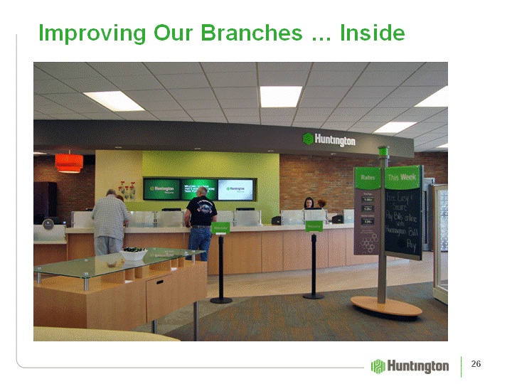 | Creating Inviting Branches 2 Year, $70MM Capital Investment Different investment levels applied based on branch profitability, transactions, traffic count and new checking productionRefurbish all 608 Branches inside and outRefurbish 1,355 ATMs 25 |