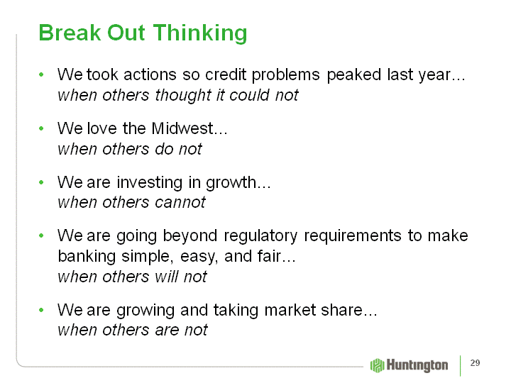 | Break Out Thinking We took actions so credit problems peaked last year... when others thought it could notWe love the Midwest... when others do notWe are investing in growth... when others cannotWe are going beyond regulatory requirements to make banking simple, easy, and fair... when others will notWe are growing and taking market share... when others are not 29 |