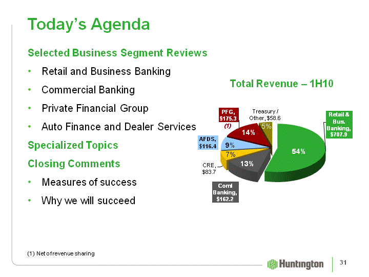 | (CHART) (1) Today's Agenda Total Revenue - 1H10 (1) Net of revenue sharing Selected Business Segment ReviewsRetail and Business BankingCommercial BankingPrivate Financial GroupAuto Finance and Dealer ServicesSpecialized TopicsClosing CommentsMeasures of successWhy we will succeed 54% 13% 7% 9% 14% 5% 31 |