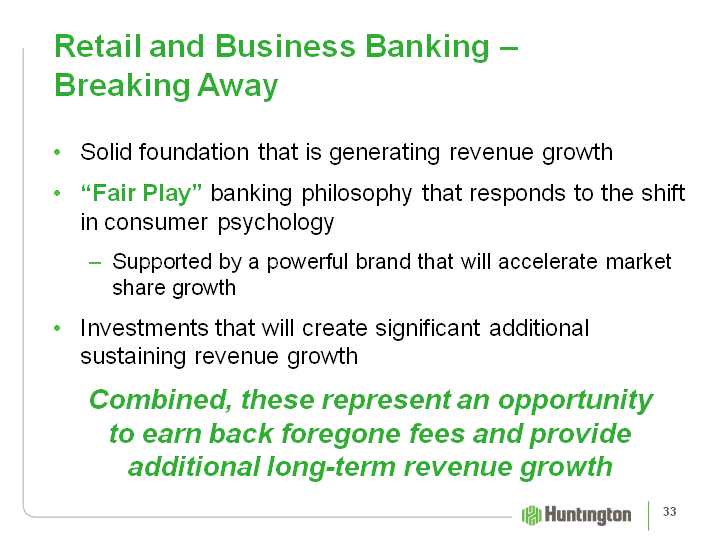 | Retail and Business Banking - Breaking Away Solid foundation that is generating revenue growth"Fair Play" banking philosophy that responds to the shift in consumer psychologySupported by a powerful brand that will accelerate market share growthInvestments that will create significant additional sustaining revenue growthCombined, these represent an opportunity to earn back foregone fees and provide additional long-term revenue growth 33 |