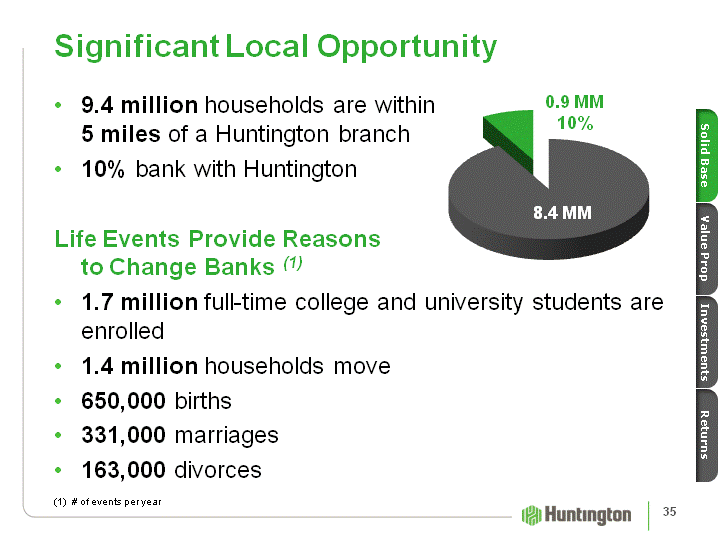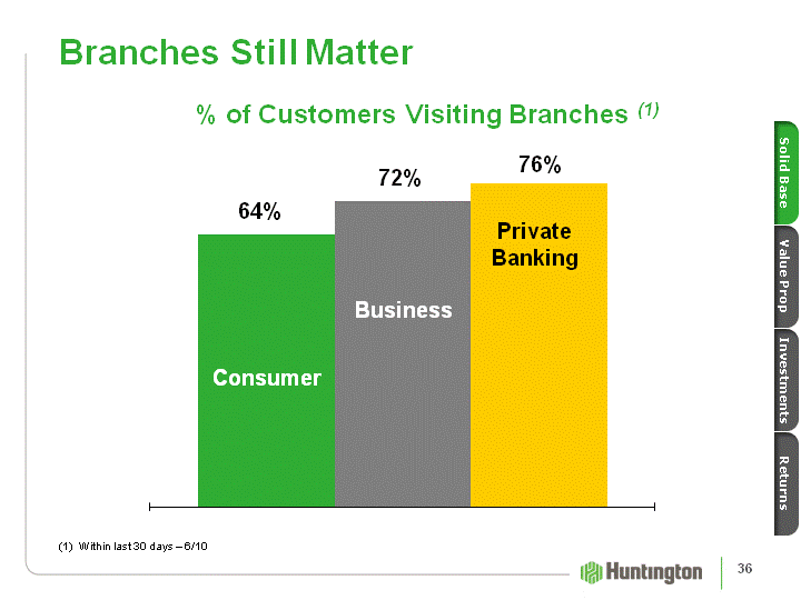 | 9.4 million households are within 5 miles of a Huntington branch10% bank with HuntingtonLife Events Provide Reasons to Change Banks (1)1.7 million full-time college and university students are enrolled1.4 million households move650,000 births331,000 marriages163,000 divorces Significant Local Opportunity (CHART) 0.9 MM 10% 8.4 MM # of events per year Solid Base Investments Returns Value Prop 35 |