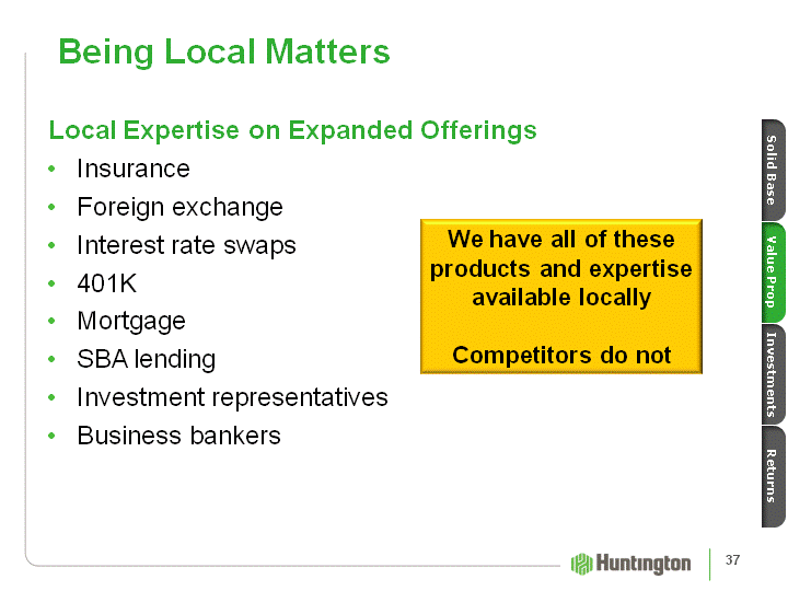 | Being Local Matters Local Expertise on Expanded OfferingsInsuranceForeign exchangeInterest rate swaps401K MortgageSBA lending Investment representativesBusiness bankers Consumer Business 69% 63% 72% 64% We have all of these products and expertise available locally Competitors do not Solid Base Investments Returns Value Prop 37 |
