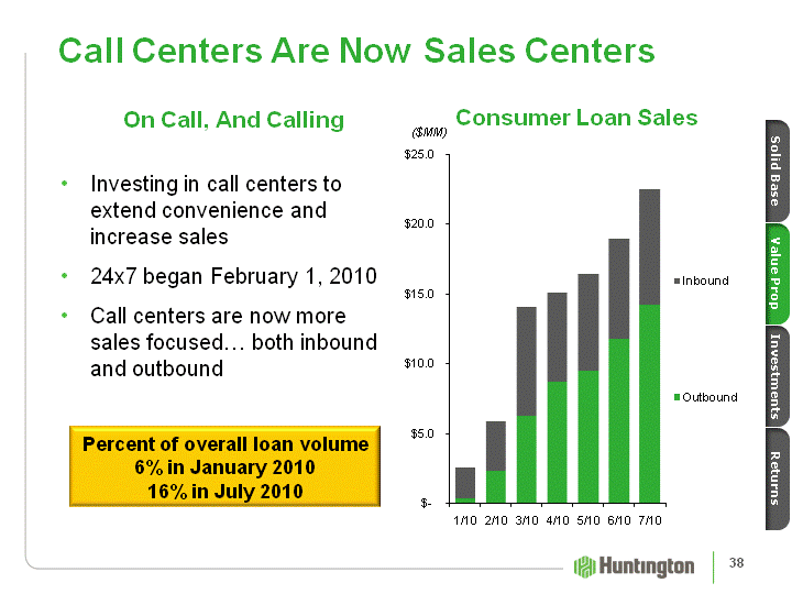 | Call Centers Are Now Sales Centers On Call, And Calling Investing in call centers to extend convenience and increase sales24x7 began February 1, 2010Call centers are now more sales focused... both inbound and outbound Consumer Loan Sales ($MM) Percent of overall loan volume 6% in January 2010 16% in July 2010 Solid Base Investments Returns Value Prop (CHART) 38 |
