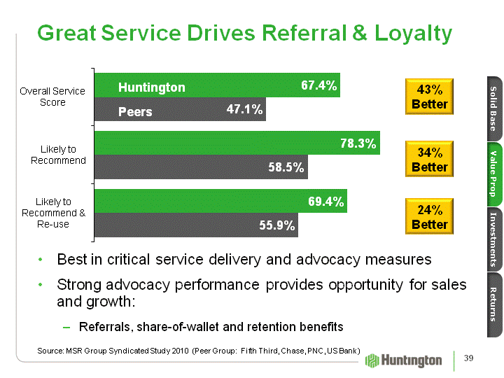 | Great Service Drives Referral & Loyalty Solid Base Investments Returns Value Prop (CHART) Best in critical service delivery and advocacy measuresStrong advocacy performance provides opportunity for sales and growth:Referrals, share-of-wallet and retention benefits Huntington Peers 43% Better 34% Better 24% Better Source: MSR Group Syndicated Study 2010 (Peer Group: Fifth Third, Chase, PNC, US Bank) 39 |