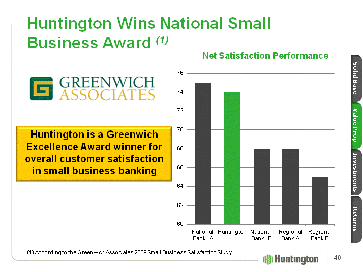 | Net Satisfaction Performance Huntington Wins National Small Business Award (1) Solid Base Investments Returns Value Prop Huntington is a Greenwich Excellence Award winner for overall customer satisfaction in small business banking(CHART) (1) According to the Greenwich Associates 2009 Small Business Satisfaction Study 40 |