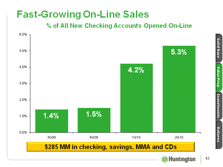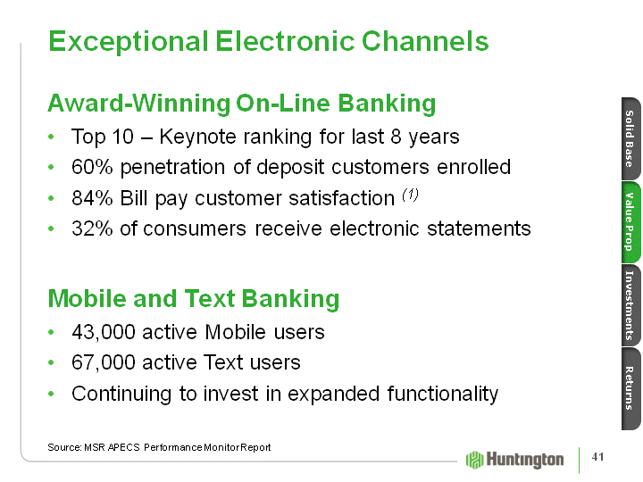 | Exceptional Electronic Channels Award-Winning On-Line BankingTop 10 - Keynote ranking for last 8 years60% penetration of deposit customers enrolled84% Bill pay customer satisfaction (1)32% of consumers receive electronic statementsMobile and Text Banking43,000 active Mobile users67,000 active Text usersContinuing to invest in expanded functionality Solid Base Investments Returns Value Prop Source: MSR APECS Performance Monitor Report 41 |