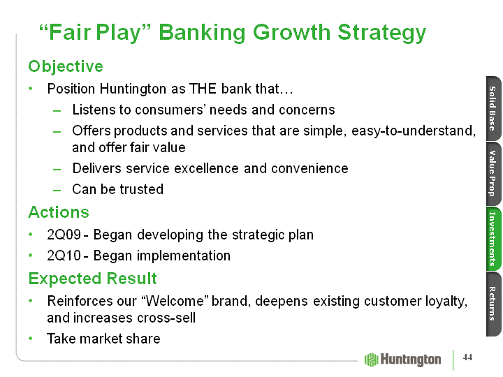 | "Fair Play" Banking Growth Strategy ObjectivePosition Huntington as THE bank that... Listens to consumers' needs and concernsOffers products and services that are simple, easy-to-understand, and offer fair valueDelivers service excellence and convenienceCan be trustedActions2Q09 - Began developing the strategic plan2Q10 - Began implementationExpected ResultReinforces our "Welcome" brand, deepens existing customer loyalty, and increases cross-sellTake market share Solid Base Investments Returns Value Prop 44 |