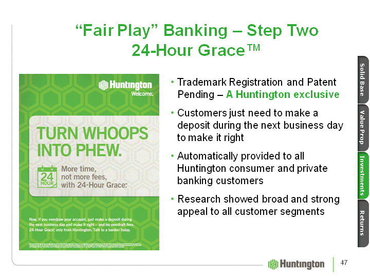 | "Fair Play" Banking - Step Two 24-Hour Grace(tm) Trademark Registration and Patent Pending - A Huntington exclusiveCustomers just need to make a deposit during the next business day to make it rightAutomatically provided to all Huntington consumer and private banking customersResearch showed broad and strong appeal to all customer segments Solid Base Investments Returns Value Prop 47 |