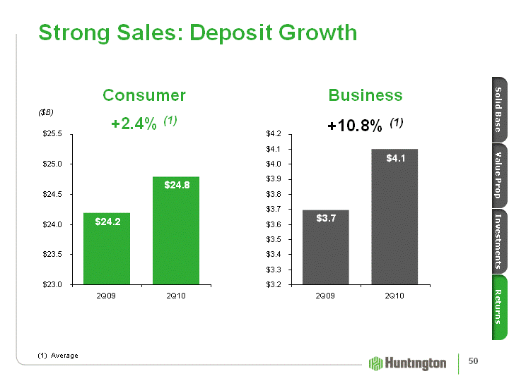 | (CHART) (CHART) Strong Sales: Deposit Growth Consumer +2.4% (1) +10.8% (1) Business (1) Average ($B) Solid Base Investments Returns Value Prop 50 |