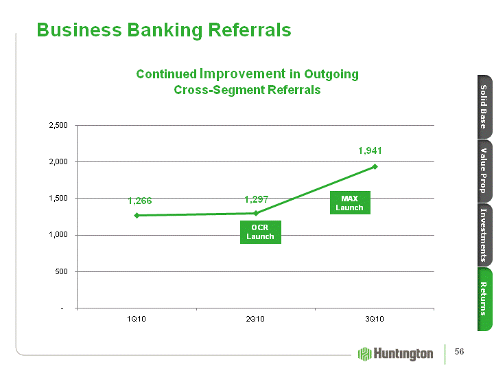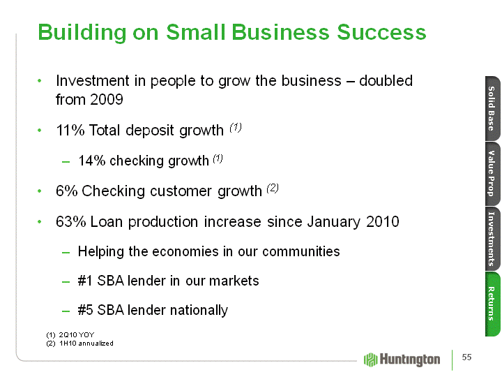 | Building on Small Business Success Investment in people to grow the business - doubled from 200911% Total deposit growth (1)14% checking growth (1)6% Checking customer growth (2)63% Loan production increase since January 2010Helping the economies in our communities#1 SBA lender in our markets#5 SBA lender nationally 2Q10 YOY1H10 annualized Solid Base Investments Returns Value Prop 55 |