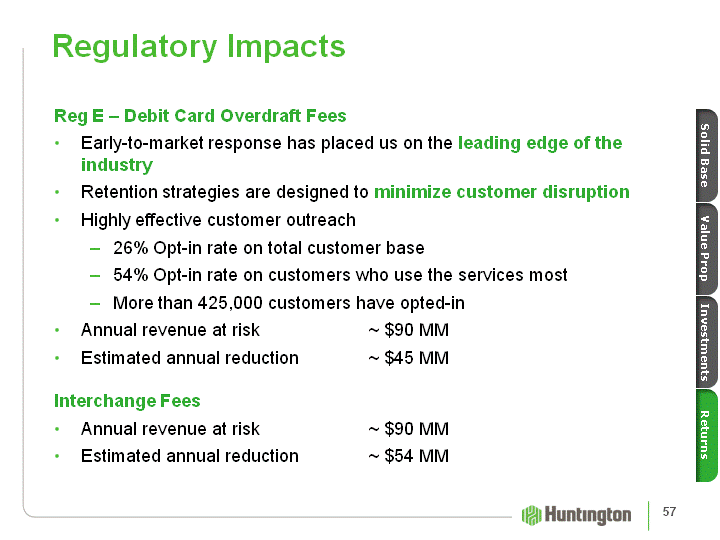 | Regulatory Impacts Reg E - Debit Card Overdraft FeesEarly-to-market response has placed us on the leading edge of the industryRetention strategies are designed to minimize customer disruptionHighly effective customer outreach26% Opt-in rate on total customer base54% Opt-in rate on customers who use the services mostMore than 425,000 customers have opted-inAnnual revenue at risk ~ $90 MMEstimated annual reduction ~ $45 MMInterchange FeesAnnual revenue at risk ~ $90 MMEstimated annual reduction ~ $54 MM Solid Base Investments Returns Value Prop 57 |