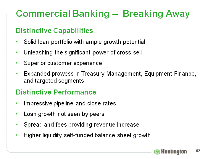 | Commercial Banking - Breaking Away Distinctive CapabilitiesSolid loan portfolio with ample growth potentialUnleashing the significant power of cross-sellSuperior customer experienceExpanded prowess in Treasury Management, Equipment Finance, and targeted segmentsDistinctive PerformanceImpressive pipeline and close ratesLoan growth not seen by peersSpread and fees providing revenue increaseHigher liquidity self-funded balance sheet growth 62 |