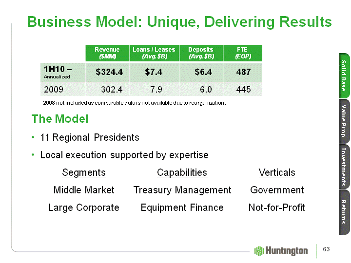 | Business Model: Unique, Delivering Results Revenue($MM) Loans / Leases (Avg. $B) Deposits (Avg. $B) FTE(EOP) 1H10 - Annualized $324.4 $7.4 $6.4 487 2009 302.4 7.9 6.0 445 2008 not included as comparable data is not available due to reorganization. The Model11 Regional PresidentsLocal execution supported by expertise Segments Capabilities Verticals Middle Market Treasury Management Government Large Corporate Equipment Finance Not-for-Profit Solid Base Investments Returns Value Prop 63 |