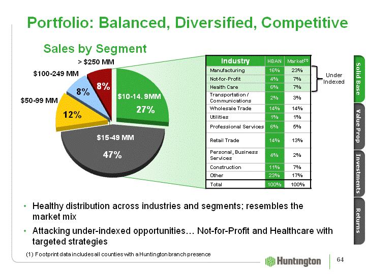 | (CHART) $15-49 MM $10-14. 9MM $50-99 MM $100-249 MM > $250 MM 8% 8% 12% 47% 27% Portfolio: Balanced, Diversified, Competitive Healthy distribution across industries and segments; resembles the market mixAttacking under-indexed opportunities... Not-for-Profit and Healthcare with targeted strategies (1) Footprint data includes all counties with a Huntington branch presence Solid Base Investments Returns Value Prop Value Prop UnderIndexed Sales by Segment 64 |
