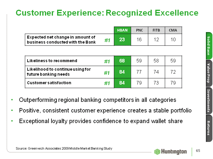 | HBAN PNC FITB CMA Expected net change in amount of business conducted with the Bank 23 16 12 10 Likeliness to recommend 68 59 58 59 Likelihood to continue using for future banking needs 84 77 74 72 Customer satisfaction 84 79 73 79 Customer Experience: Recognized Excellence Source: Greenwich Associates 2009 Middle Market Banking Study Outperforming regional banking competitors in all categoriesPositive, consistent customer experience creates a stable portfolioExceptional loyalty provides confidence to expand wallet share Solid Base Investments Returns Value Prop #1 #1 #1 #1 65 |