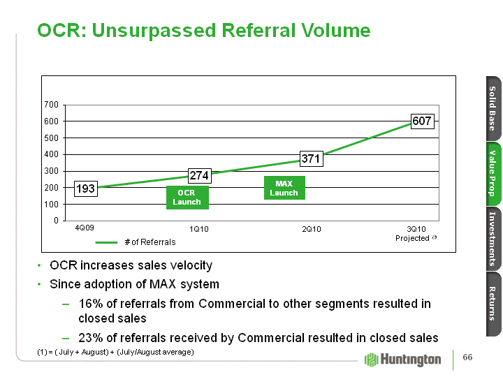 | (CHART) OCR: Unsurpassed Referral Volume OCR increases sales velocitySince adoption of MAX system16% of referrals from Commercial to other segments resulted in closed sales23% of referrals received by Commercial resulted in closed sales Solid Base Investments Returns Value Prop OCR Launch 4Q09 1Q10 2Q10 3Q10 Projected (1) MAX Launch (1) = ( July + August) + (July/August average) # of Referrals 66 |